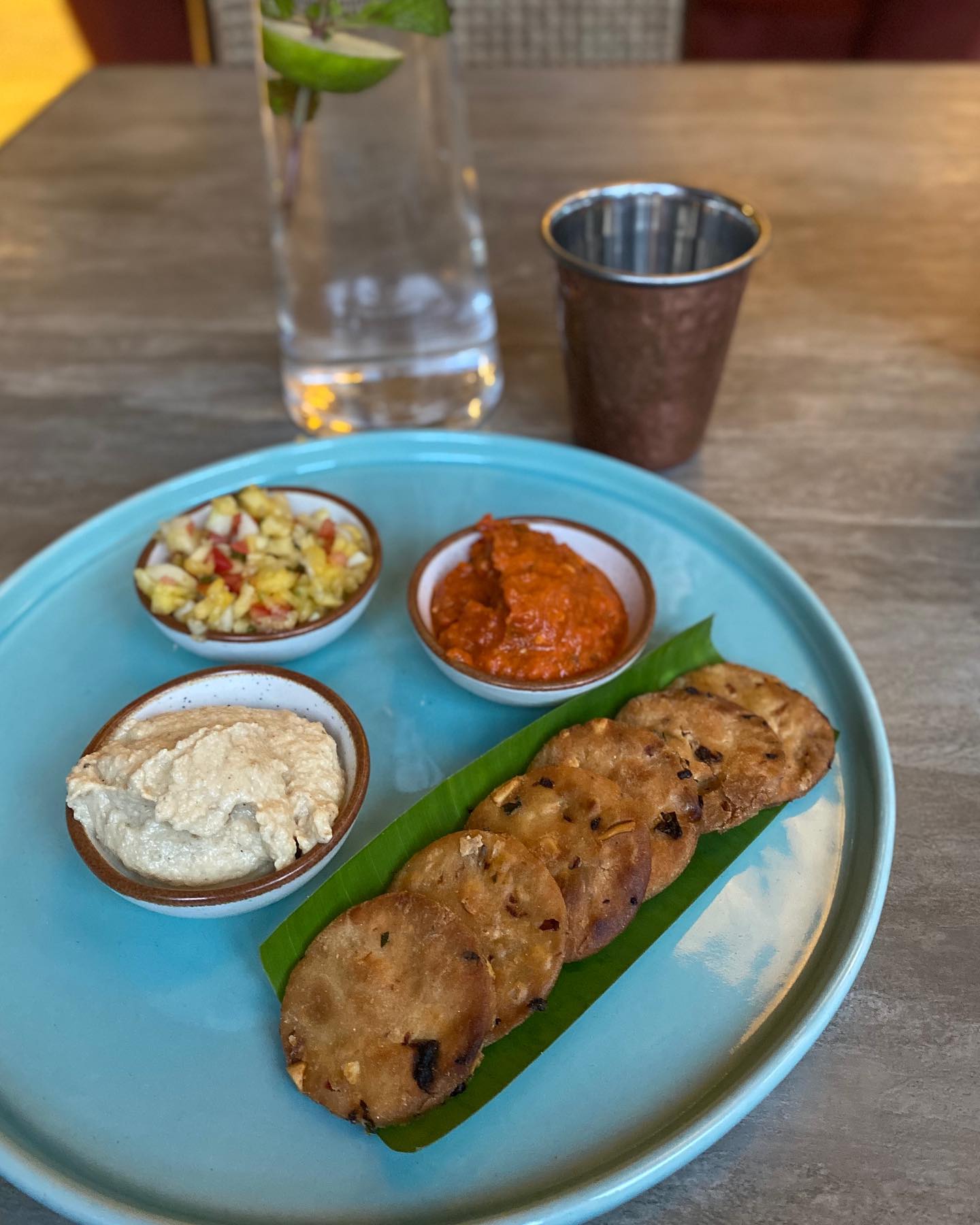 🌳1枚目の写真は、わたしの好きな南インドの軽食「マドゥール・ワダ Maddur Vada」がお洒落にアレンジされたもの。先日「Go Native」のカフェで注文した。本家の大判よりも食べやすく、添えられたチャトゥニもおいしくて気に入った。