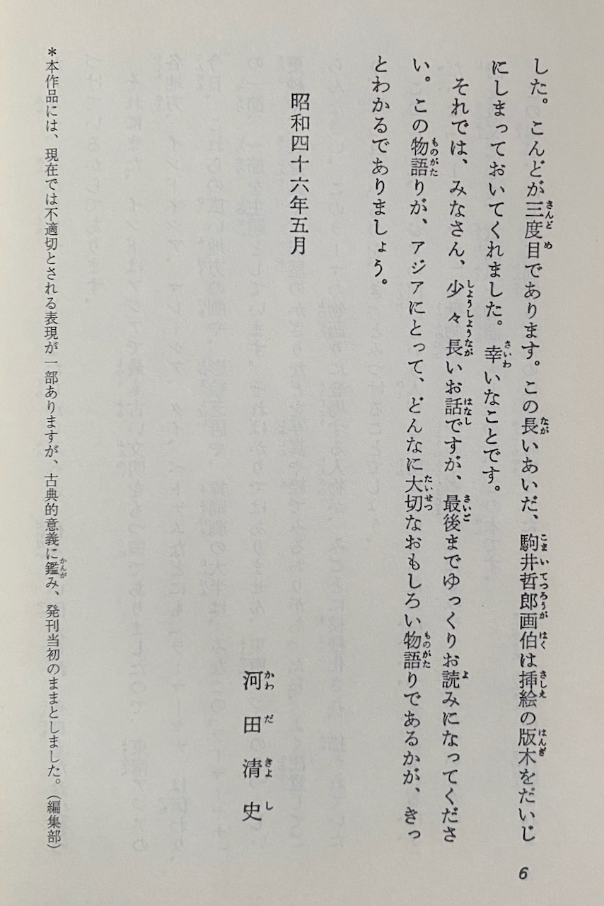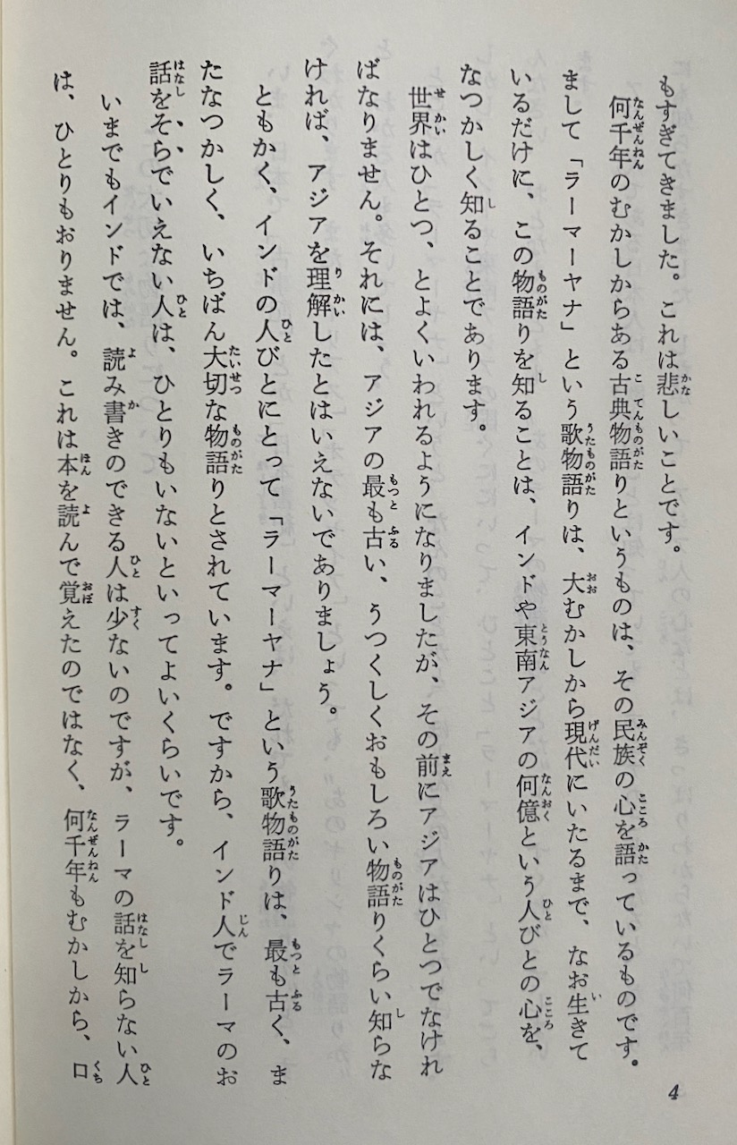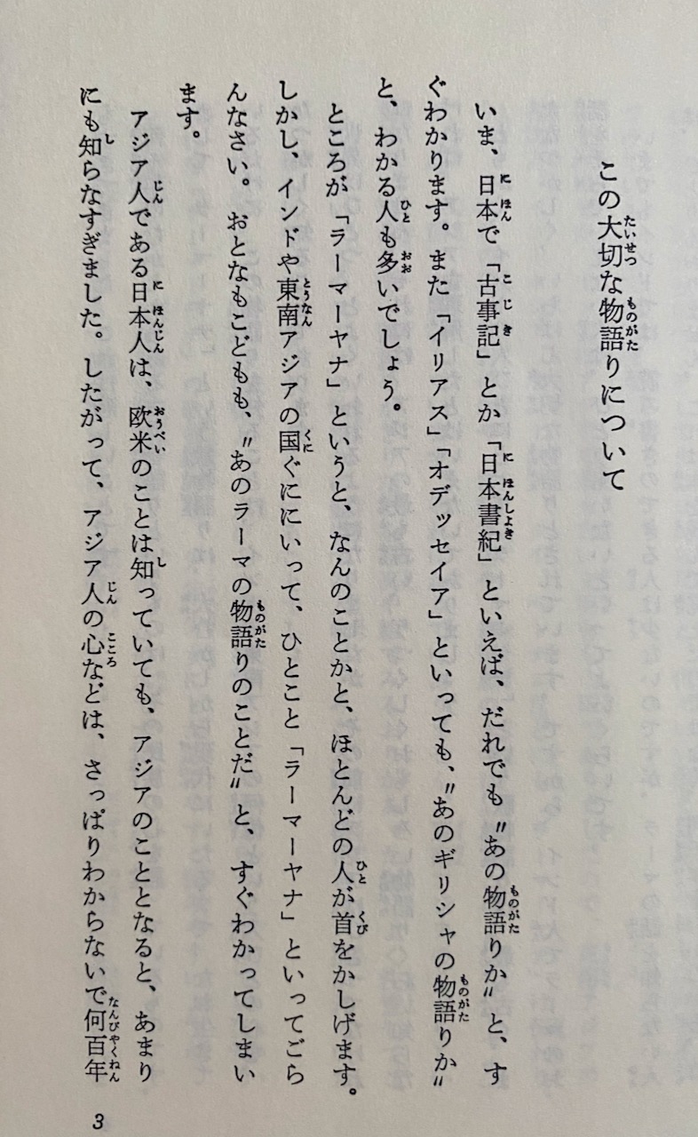 わたしが読んだのは、この「子ども向け」と思しき、わかりやすい『ラーマーヤナ』。ちょうど50年前に記された著者による前書きが、この物語の大切さを伝えているので、その部分だけ、写真にて転載する。
