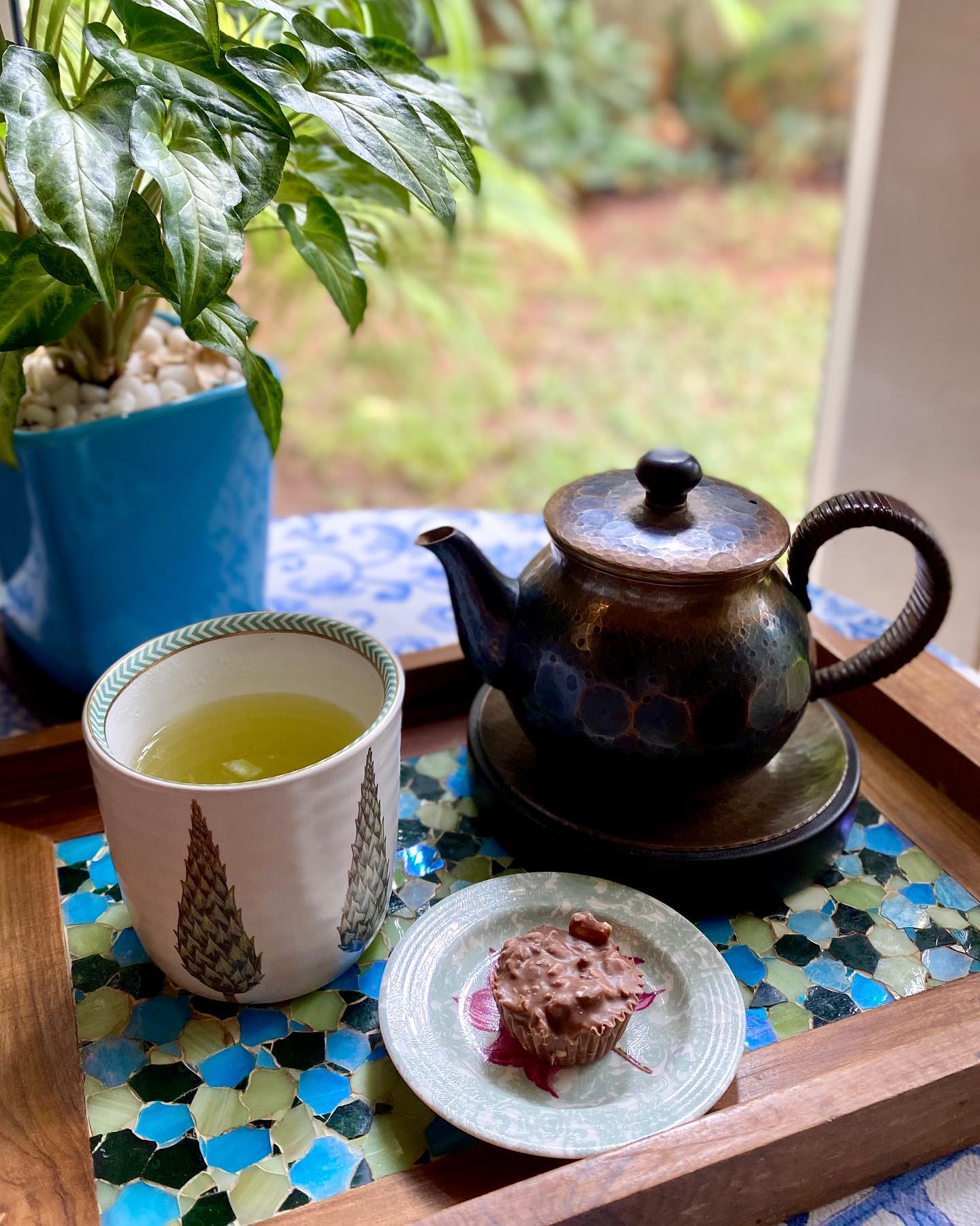 ☕️普段、わたしはコーヒー派ですが、日本茶も好きなので、飲む頻度を増やそうと思っています。写真の急須は、以前も何度か紹介した玉川堂 @gyokusendo 。麗しき職人技。本当に気に入っています。湯飲み&小皿はインドの @Goodearth 製。チョコレートはバンガロールの @smoor.in 。抹茶ロールケーキは「マルハン家の食卓」で人気の焼き菓子。本気抹茶をふんだんに使用した風味豊かなクリームと、しっとりスポンジのバランスが絶妙。急に食べたくなってきた。焼こうかな。