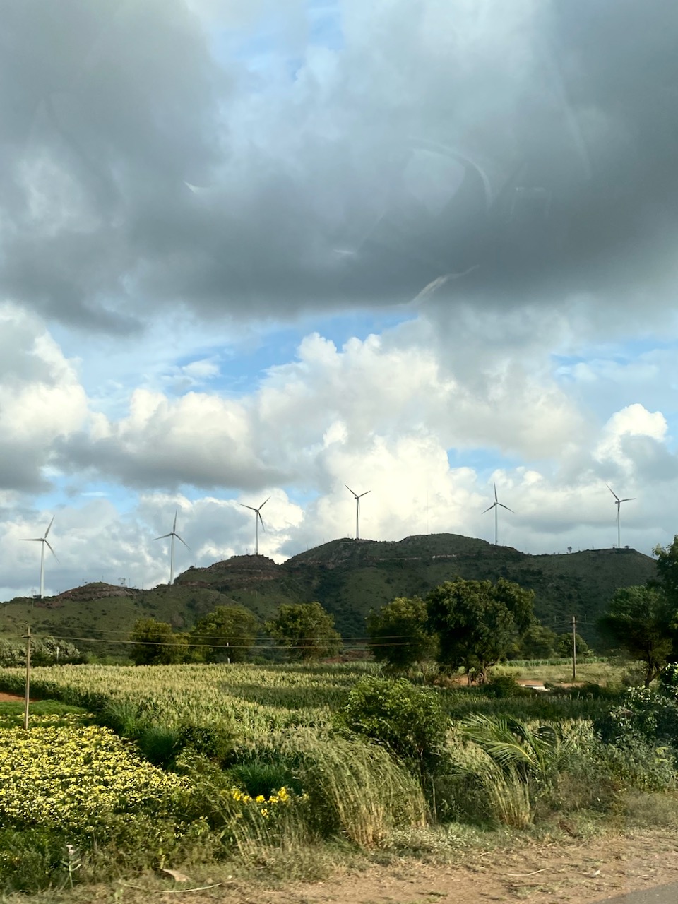 ハンピへの道は、最近、高速道路が整備されていて非常に滑らか。途中からは、3年前とは異なる見晴らしのよい景観が広がる。随所に風力発電の風車が見られるなど、心地よいドライヴだ。しかしながら、ハイウェイが開通したばかりで、肝心の分岐点に適切な看板がないところもあり。Googleマップも情報が遅れており、結論からいえば、行きつ戻りつを何度か繰り返した。詳細を大幅に割愛するが、夫&ドライヴァー、地図を読めない二人に翻弄され、本来は4〜5時間で到着するところ、6時間以上かかって到着。マルハン家にありがちな事態につき。