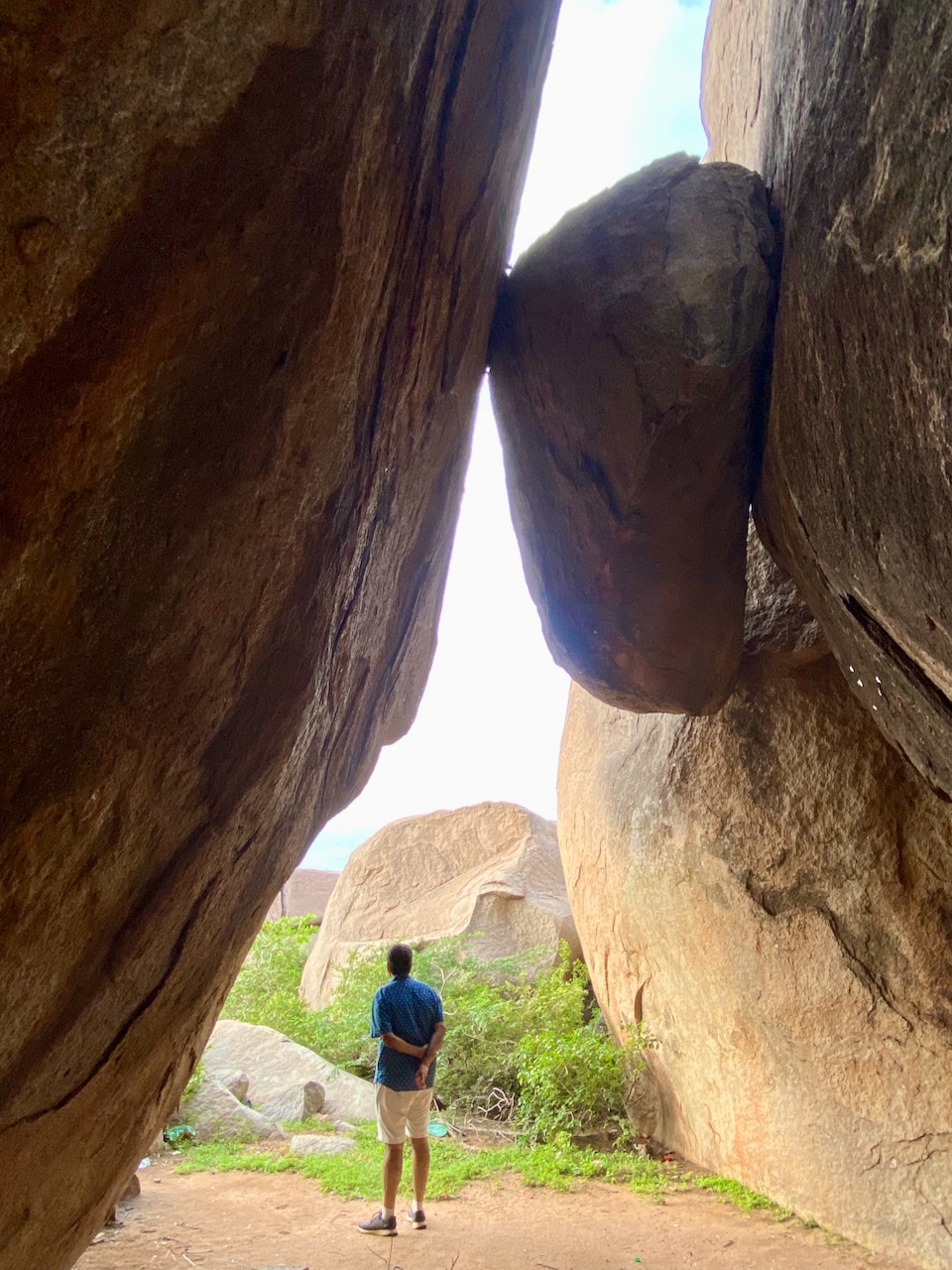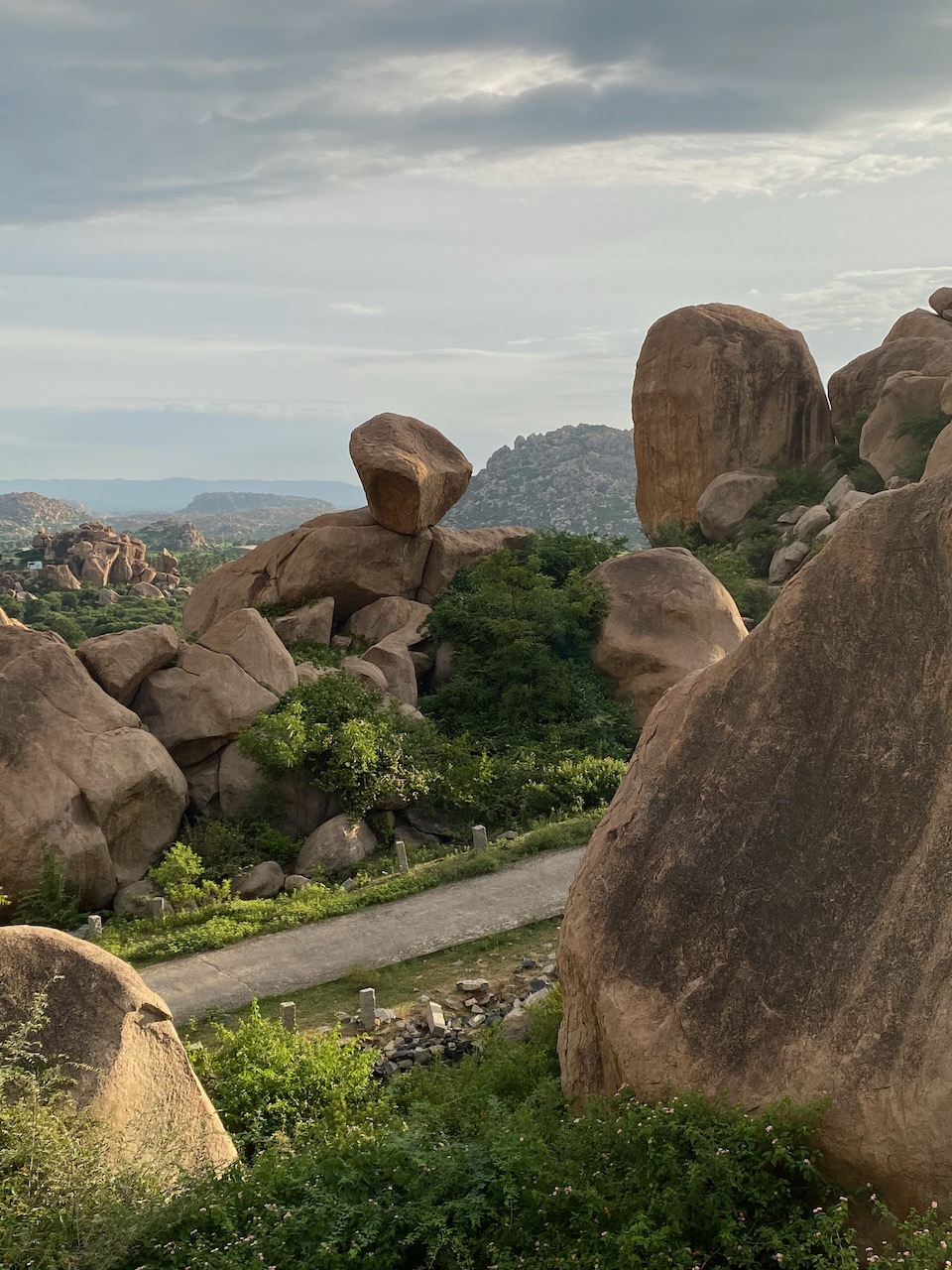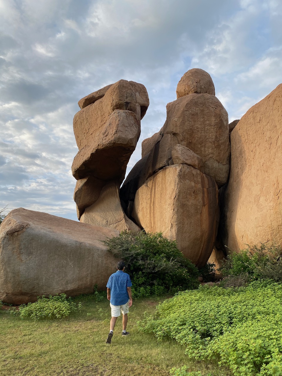 山間の、いくつかのカーブをやりすごした果てに、見通しのいい場所に出た。前方にユニークな形状の巨岩が見える! 無論、ハンピでは至る所で、このような巨岩が転がってはいるのだが、間近に迫って歩いたり、写真を撮ったりするとなると、場所を選ばねばならない。ここは足場もよく、いかにも訪れやすい。