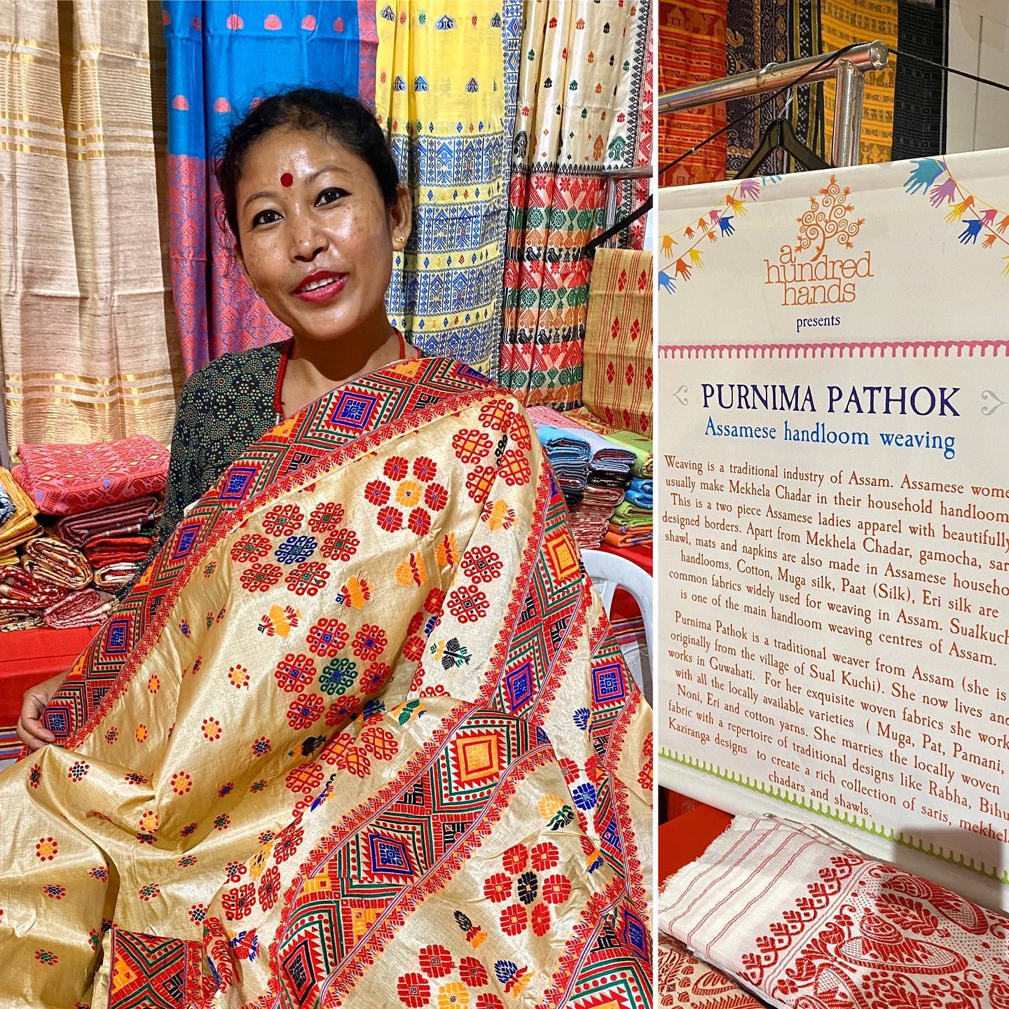 伝統的なアッサムのサリーを羽織る彼女。自らデザインした7つの花のモチーフは、北東7州、通称「セブン・シスターズ」を表しているという。パンデミックの苦境を花に変えて織り上げた。