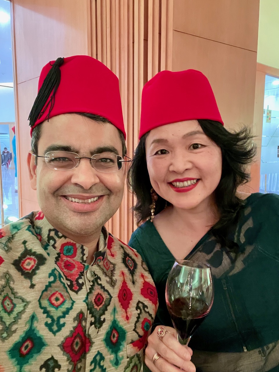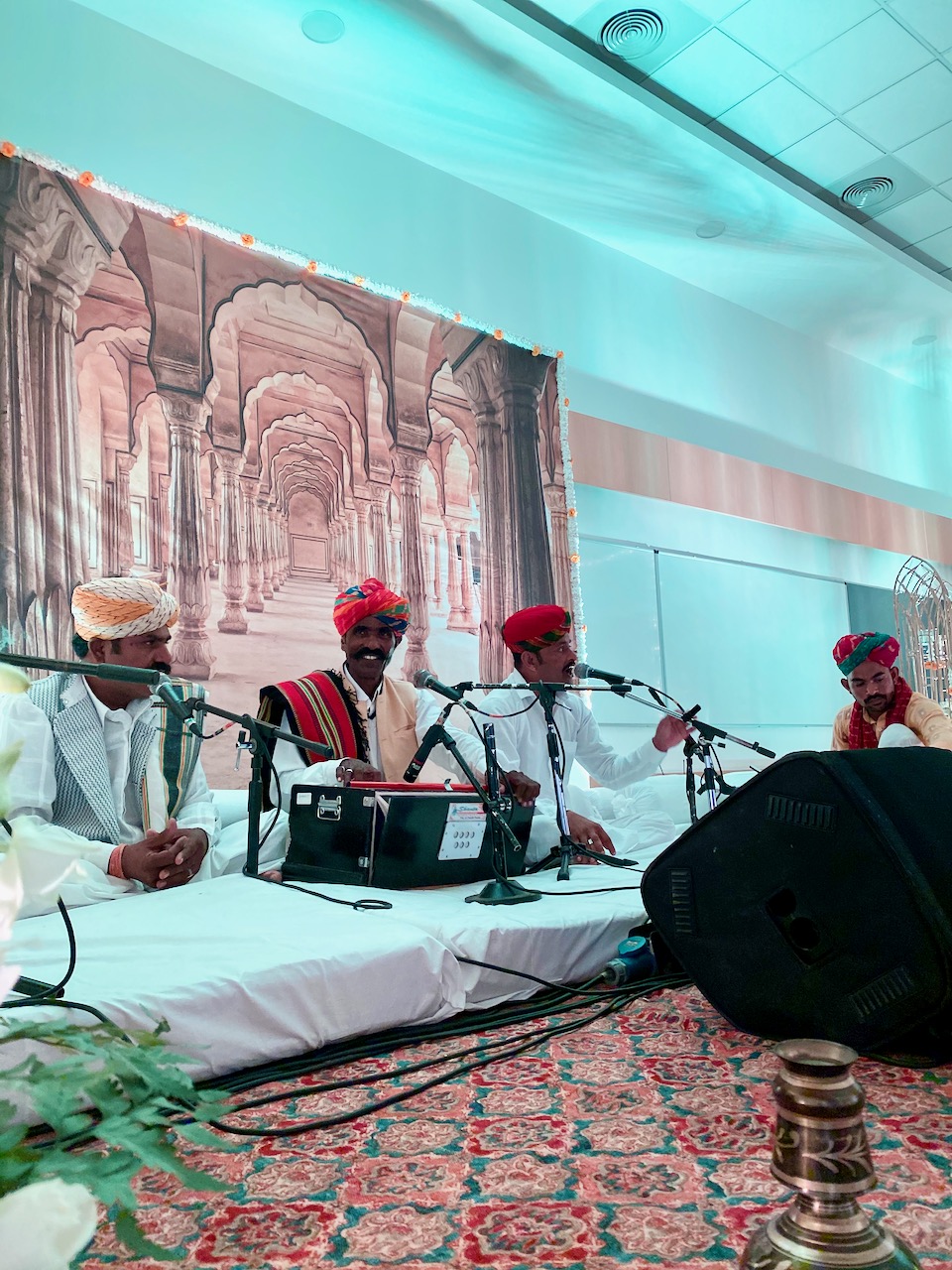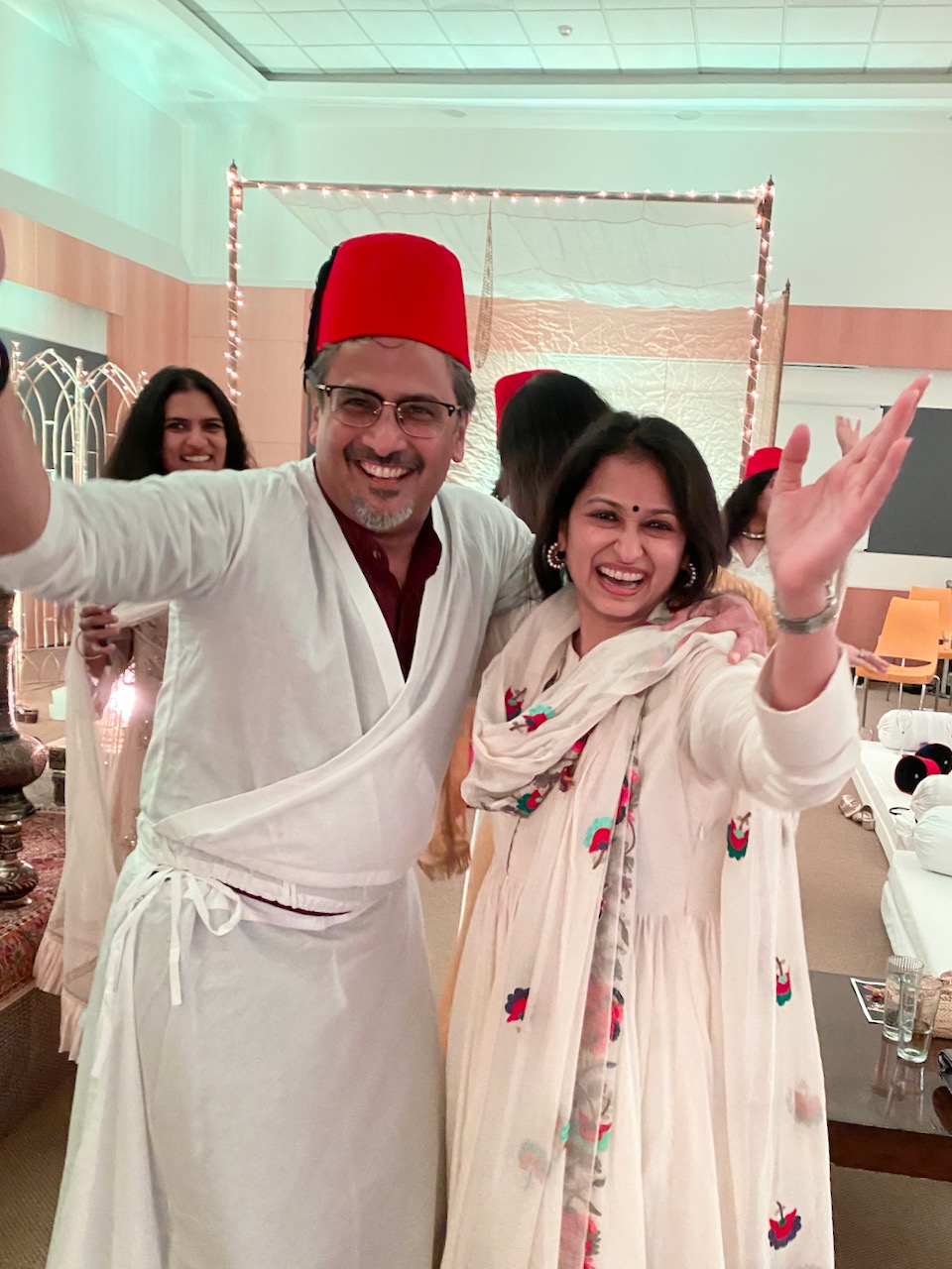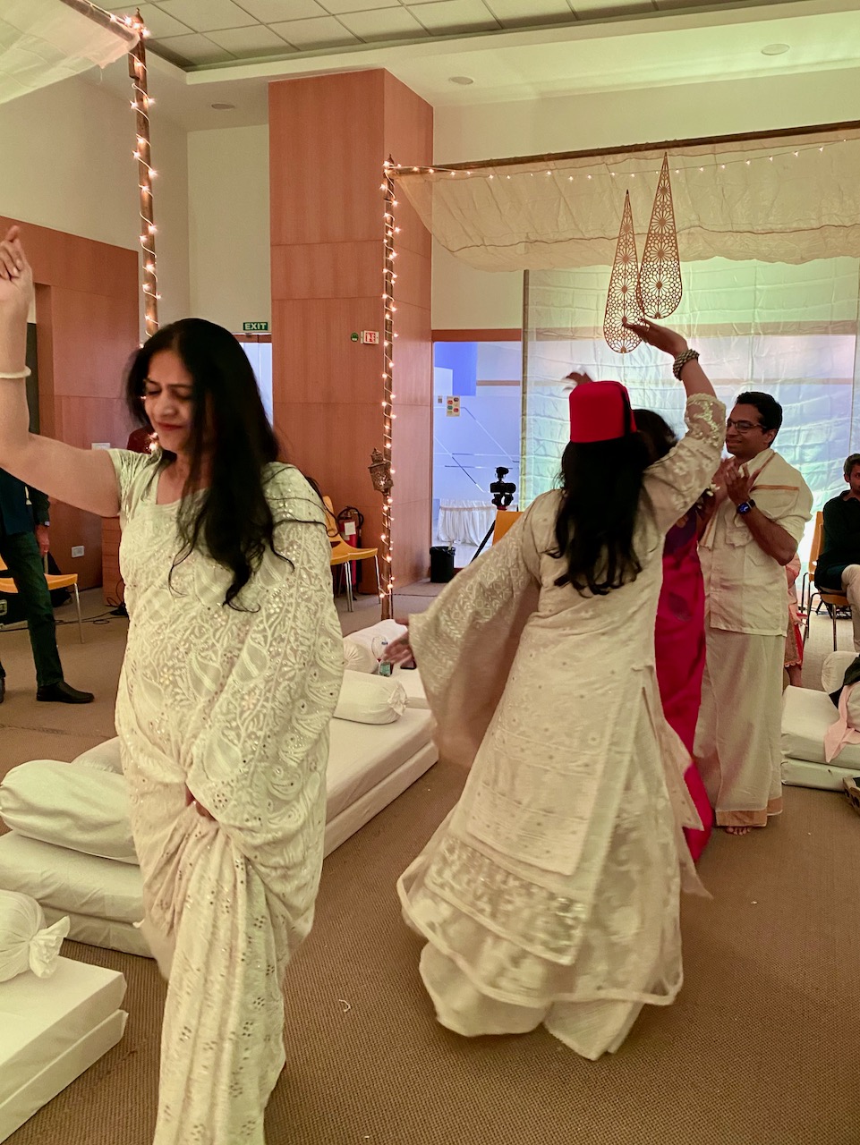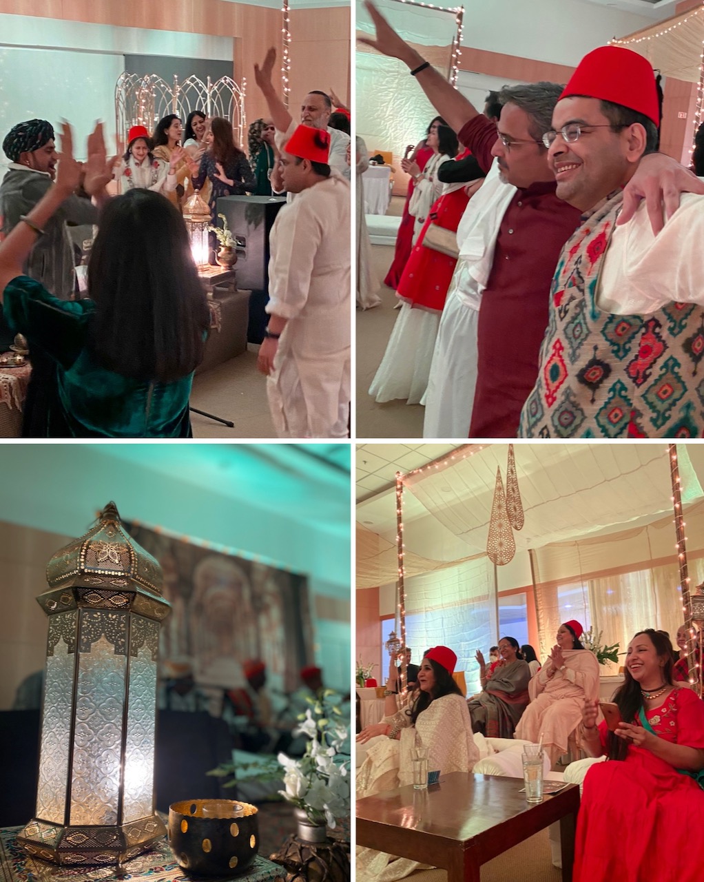 カクテルで友人たちと会話を楽しんだ後、ラジャスターンから訪れた楽団の演奏を聞く。最初は座って聴いていた観衆だが、中盤からは踊り始める。男性は、用意されていた白いスカートとシャツを着て、くるくると回りながら踊り出す。