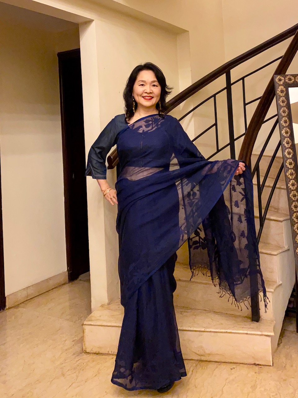 なお、ブラウスは、先日サリー専門店のTANEIRA(TATAグループ)で購入した既製品。幸いにも、お直し不要でピッタリサイズのブラウスが、デザインもおしゃれだったことから購入した。他のサリーにも合わせやすいデニム素材でとても気に入っている。