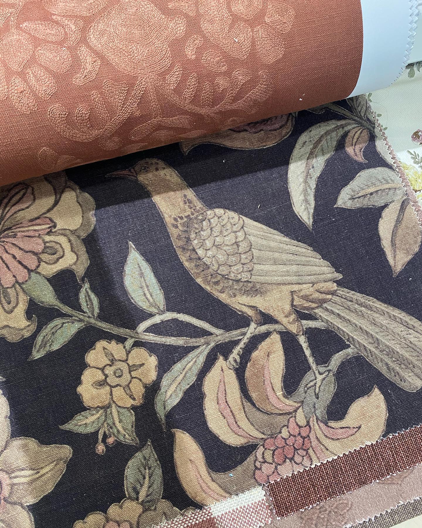 たとえば写真のソファー。ヴィンテージのローズウッド(紫檀)のソファーに合うファブリック(布)の選択肢が、途轍もなく多い。そんな中から、絞り込んだこの柄。別の店で購入した他のソファーとのバランス、クッションの具合などとも、写真を撮り、脳内でアレンジし、じわじわと、決めてきた。