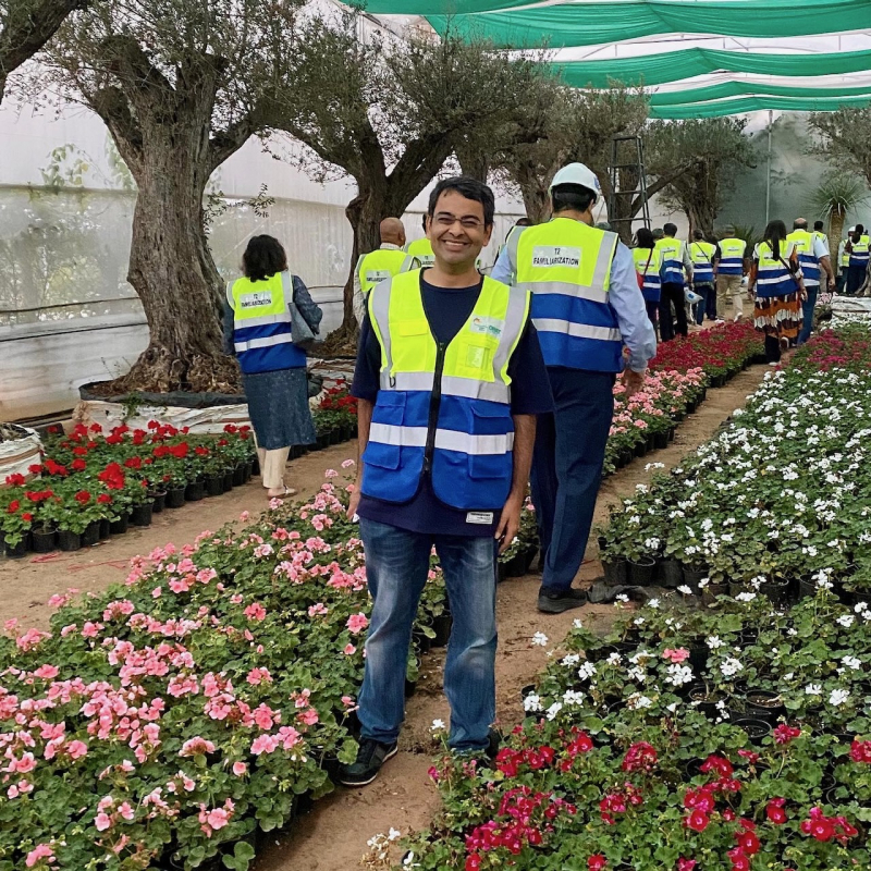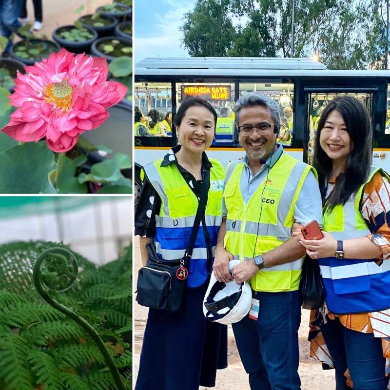 広大なナーサリーの一隅を見学させてもらったが、そこは、数千年前の古来からインドに存在する種の樹木をはじめ、世界各国から運ばれてきた無数の樹木や植物が溢れていた。樹齢数百年の、しかし小ぶりの木々。日本から来た木もある。わたしが一緒に写っているのがそれだ。西ガーツ山脈の西、デカン高原の南に位置するバンガロールは、土壌に恵まれていることもあり、多くの外来種が根付きやすいという。