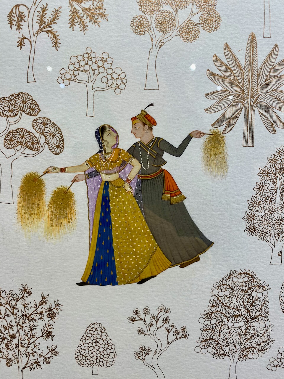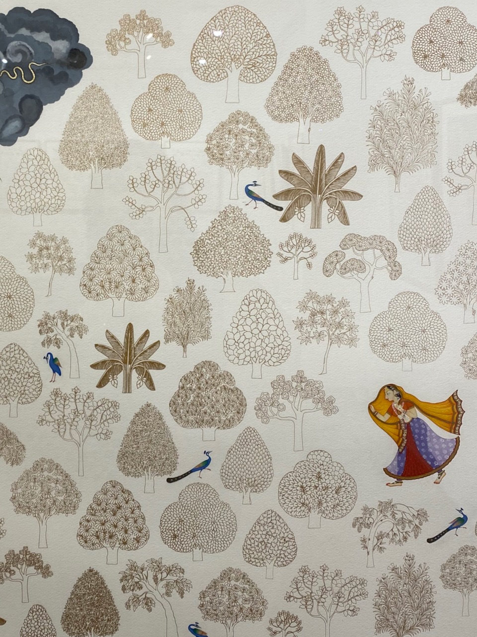 あるいは、故郷を彩る無数の樹木を丁寧に描き、細密画のアーティストとのコラボレーションで一つの作品に仕上げたものなども、絵画に込められたメッセージがストレートに伝わってきて楽しい。