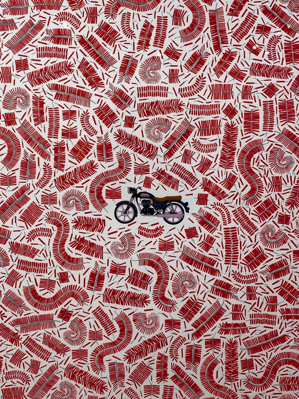 インドの伝統的な手工芸世界について、多くの示唆を与え続けてくれる我が友人Devika。2枚目の写真は、先日、彼女のFacebook投稿で目に止まった絵画だ。バイクの周辺に散らばる赤い模様は、ディワリなどで使われる爆竹。Madan Meenaの作品で、タイトルはChildhood Memories – BULLET CHAAP PATAKHA とある。