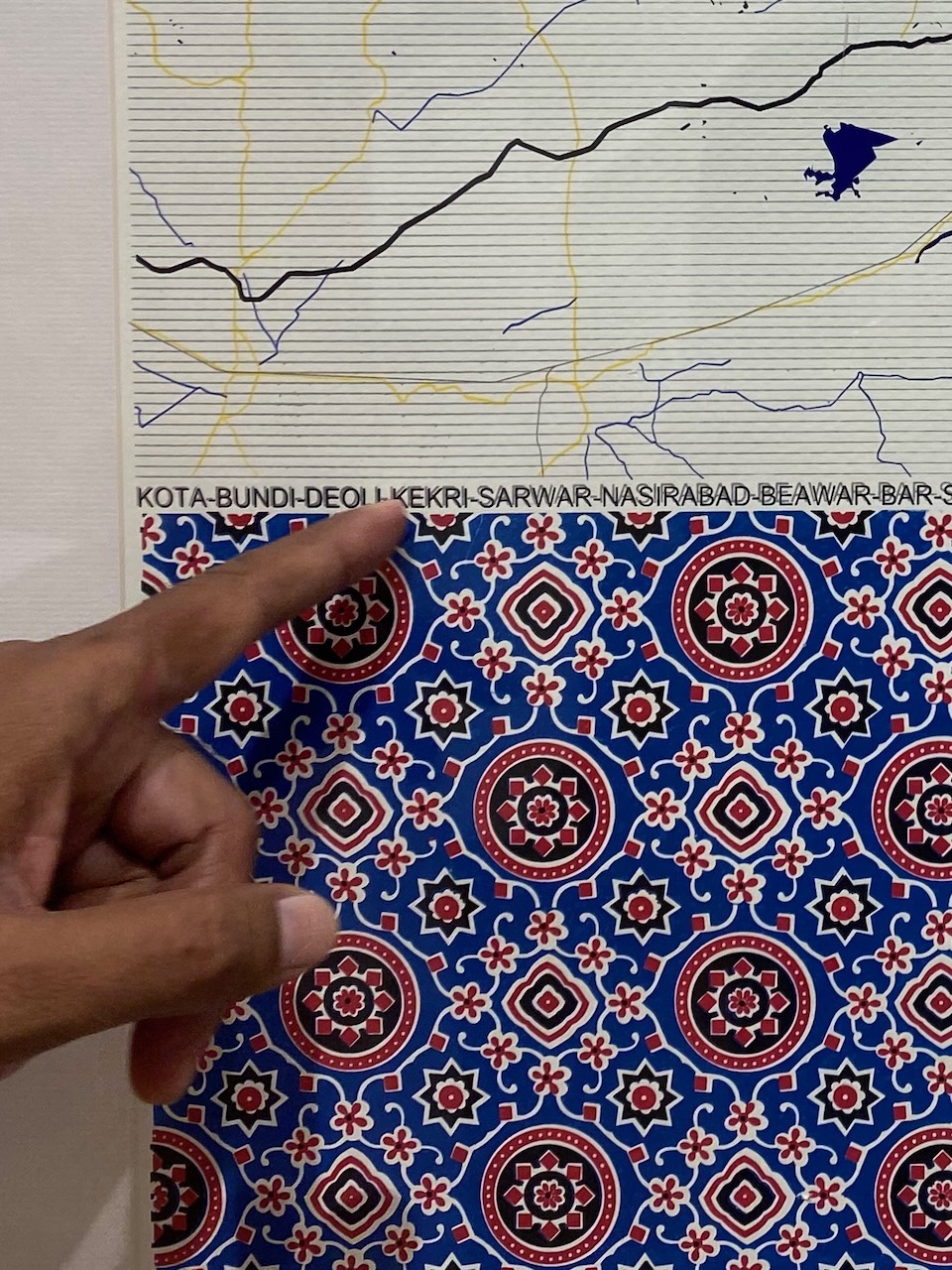たとえば、アジュラークと呼ばれるインドでも最も古いハンドブロック・プリント。16世紀の大航海時代以降、日本に伝わった「インド更紗」のひとつでもある。そのアジュラーク発祥と伝播を伝える「地図」を絵画的に仕上げた作品や、ジャイプールの、やはり「地図」をモチーフにして、伝統工芸発祥の地をポイントしたものなどは、極めて興味深い。