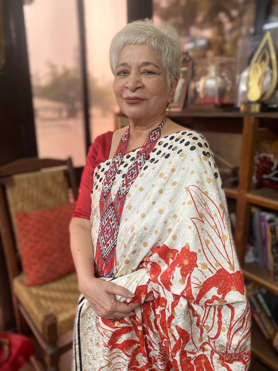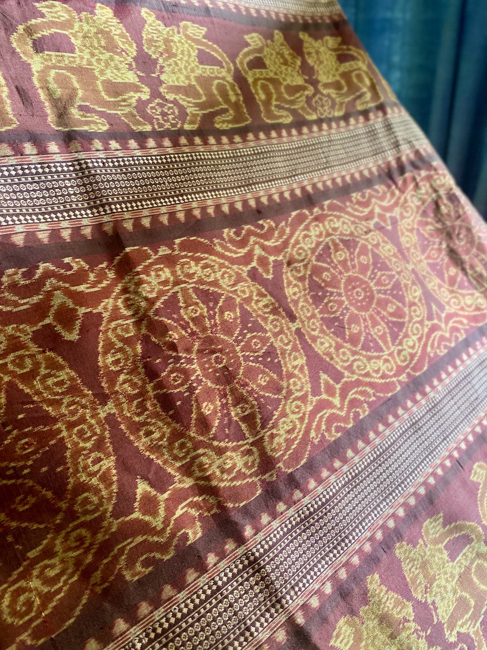 わたしが着ているのは、10年以上前にDASTKARのネイチャー・バザールで購入した、オリッサ州のイカット(絣かすり)。高度な職人の技によって生まれた、芸術的な一張羅だ。ライラもまた、意匠は異なるものの、オリッサ州のイカットのサリーを着ていらした。