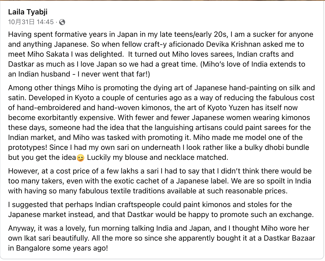 昨日、お会いして数時間も経たないうちに、彼女はご自身のソーシャルメディアに写真と真摯な文章をアップロードしてくださった。京友禅サリーに関しても、忌憚のない意見を述べてくださると同時に、コラボレーションを提案してくださった。来年には、DASTKARの会場でのイヴェントも実現できそうだ。