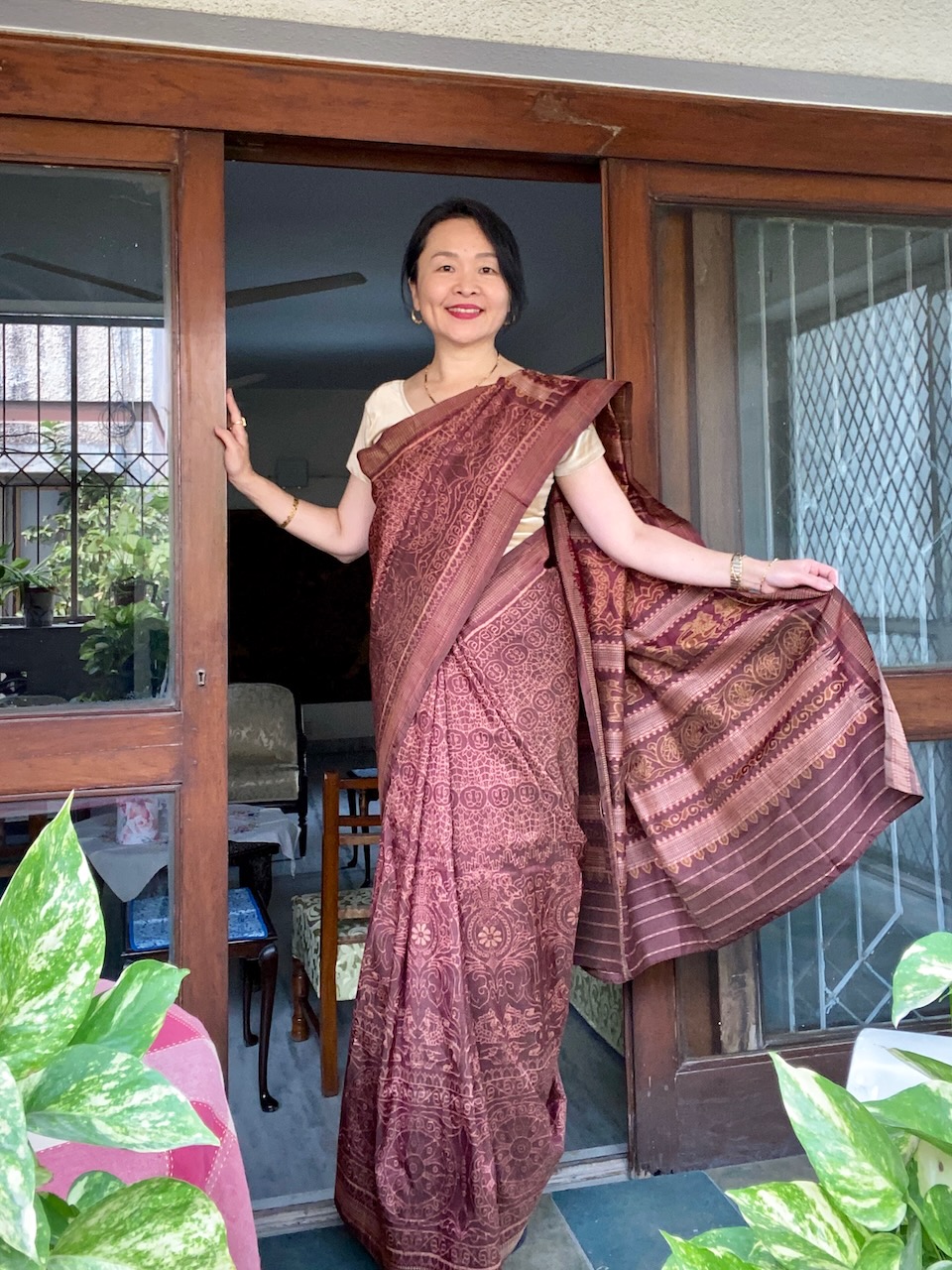 彼女とお会いすることが決まった直後、わたしは、正式に、京都友禅サリーのプロモーターになった。これは絶好のタイミングだと思い、日本の職人の技術が息づく、2枚のサリーをお持ちした。その1枚を彼女に着てもらった。すでに着ていらしたサリーの上からまとっていただいたのだが、色合いもぴったり。本当にお似合いだ。