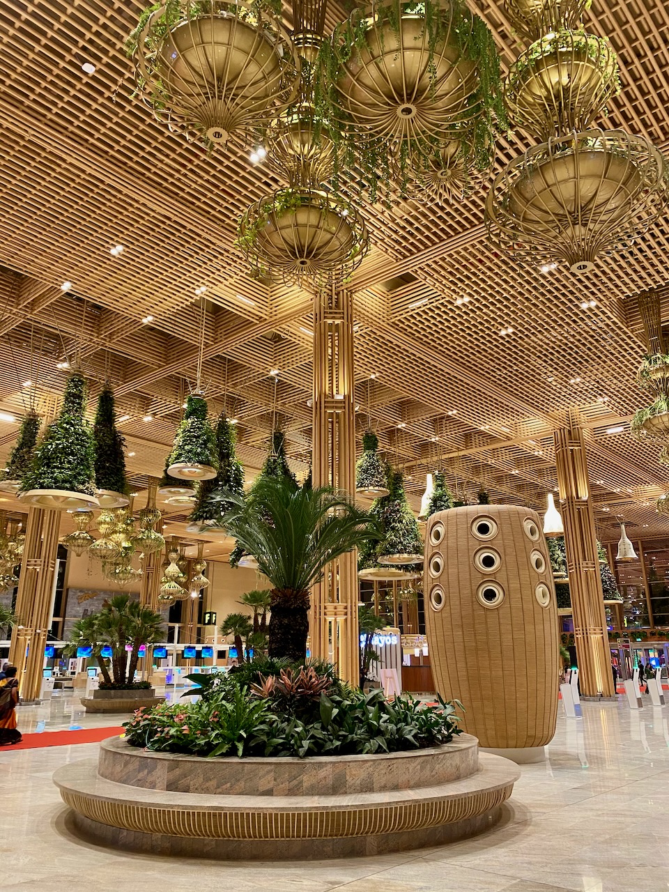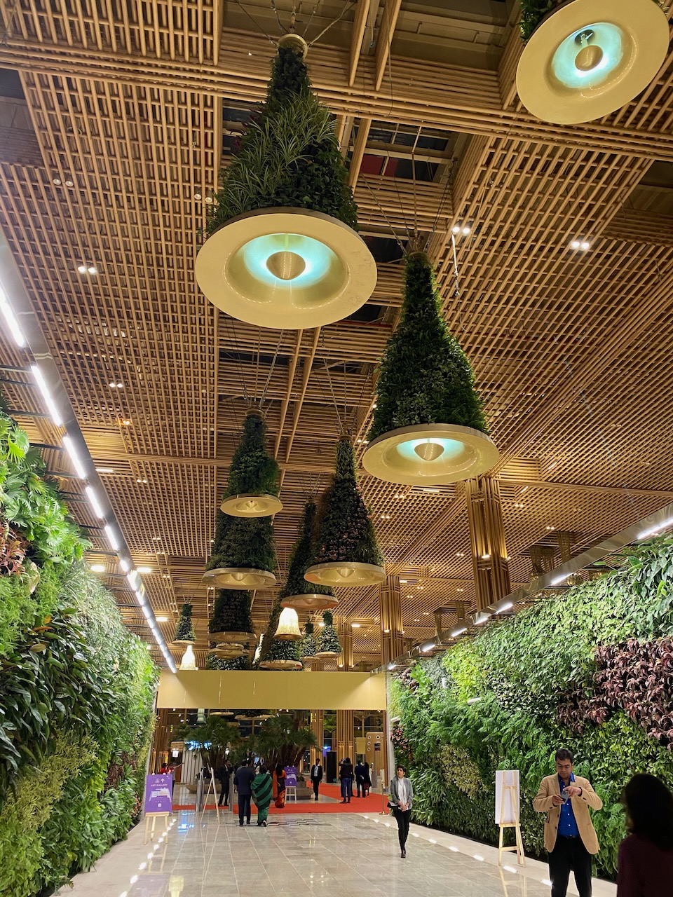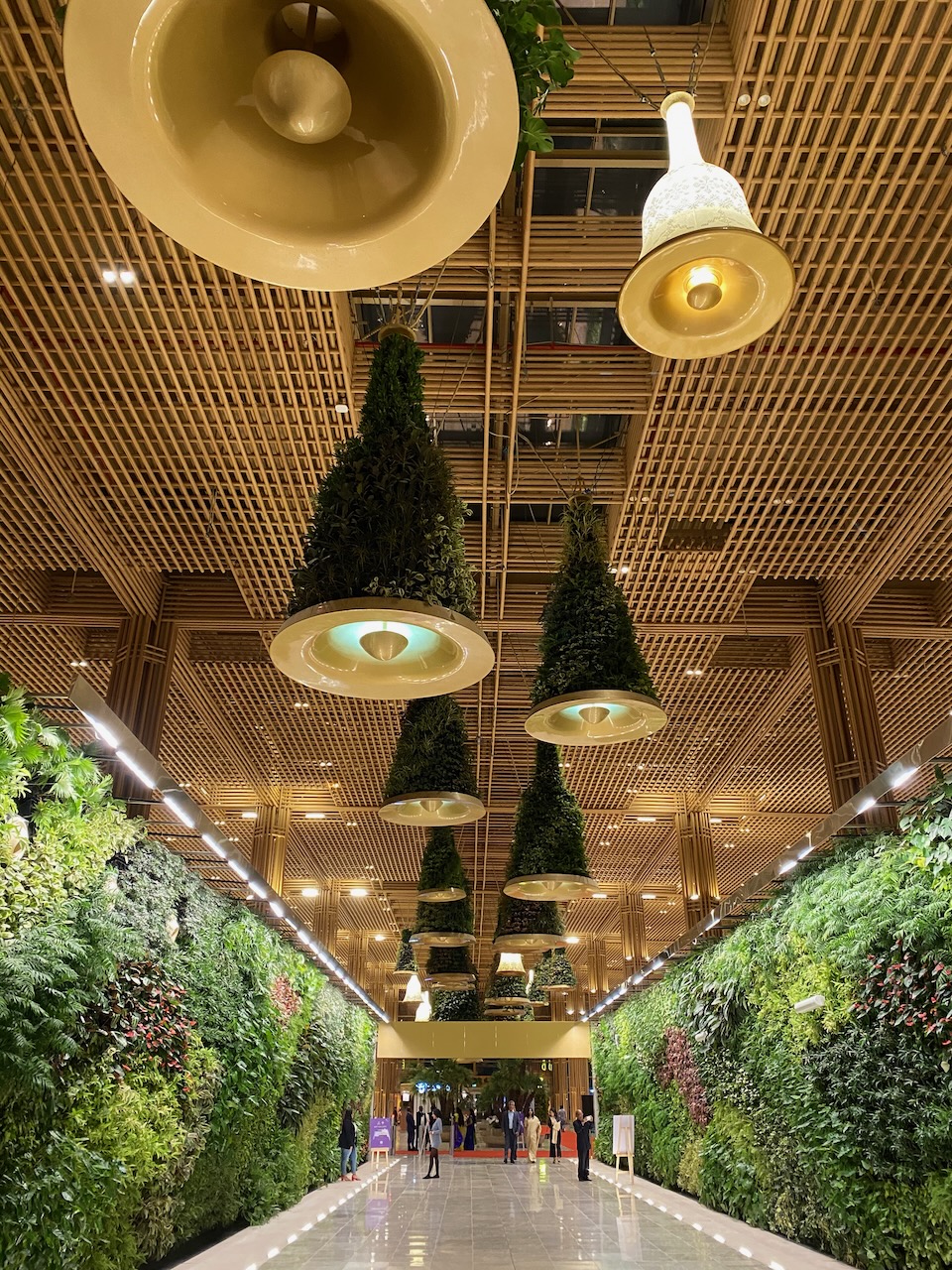 鉄筋を隠すために、竹の木材を用いられたターミナル。天井に吊るされている植物はもちろん天然自然のもので、天井からの水供給の仕組みも整っている。昼間は天井のガラスから自然光が降り注ぐ。