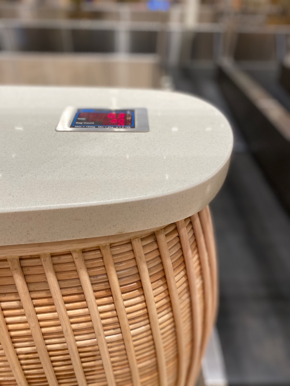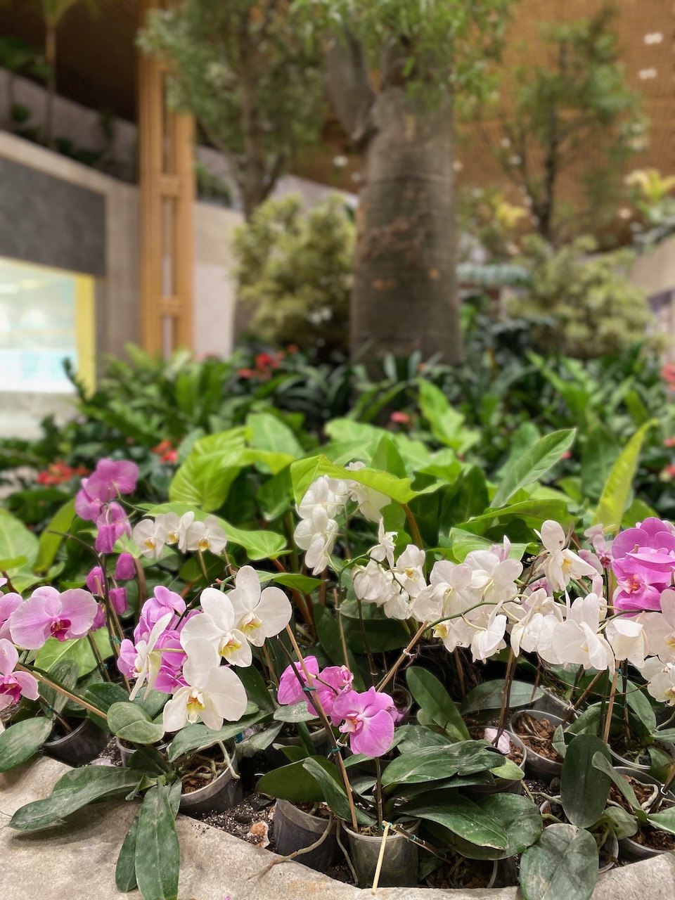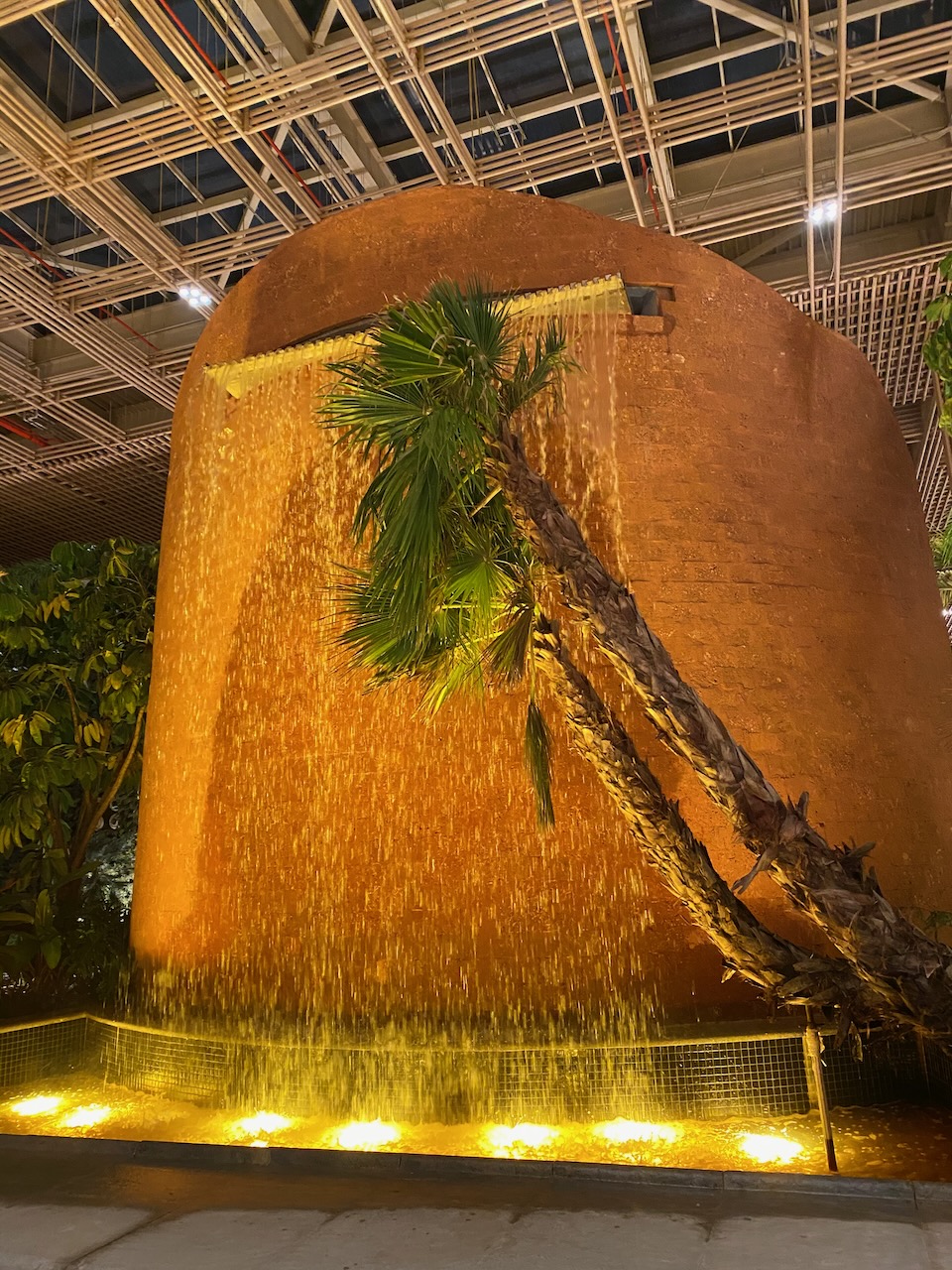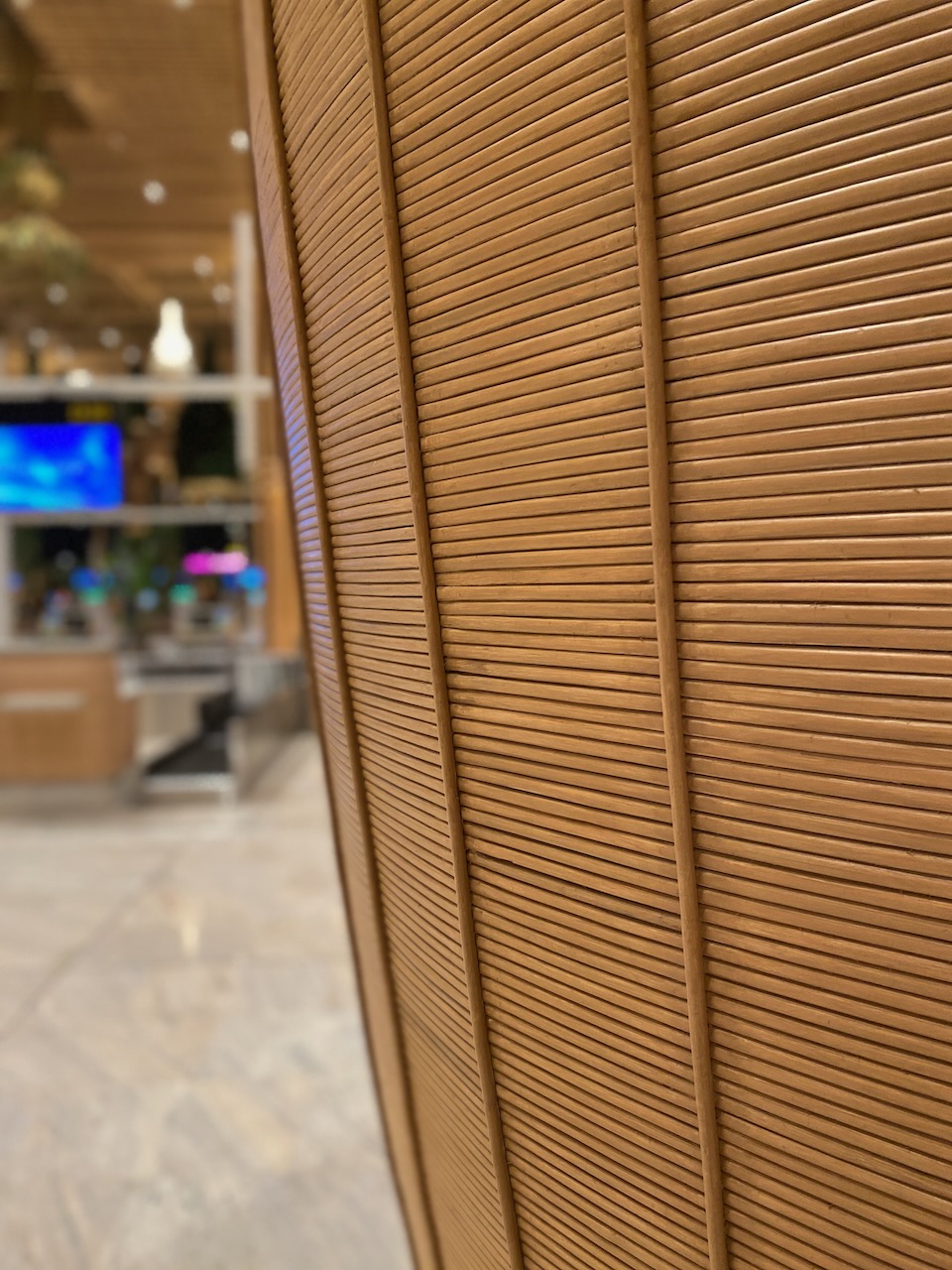 鉄筋を隠すために、竹の木材を用いられたターミナル。天井に吊るされている植物はもちろん天然自然のもので、天井からの水供給の仕組みも整っている。昼間は天井のガラスから自然光が降り注ぐ。