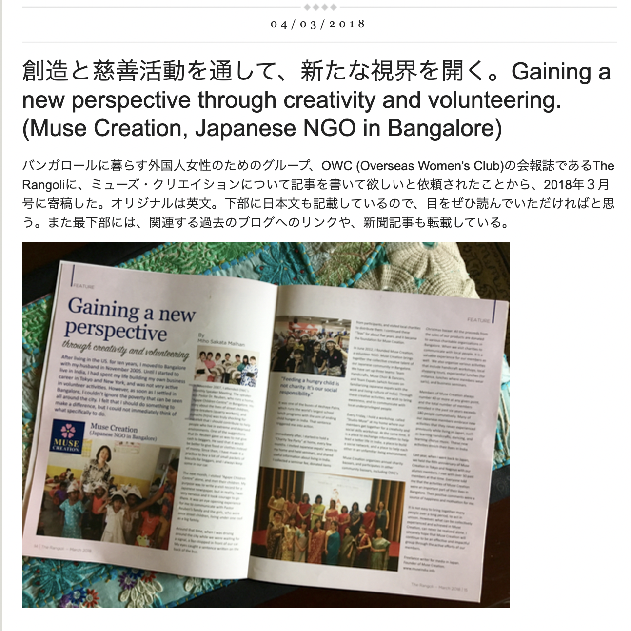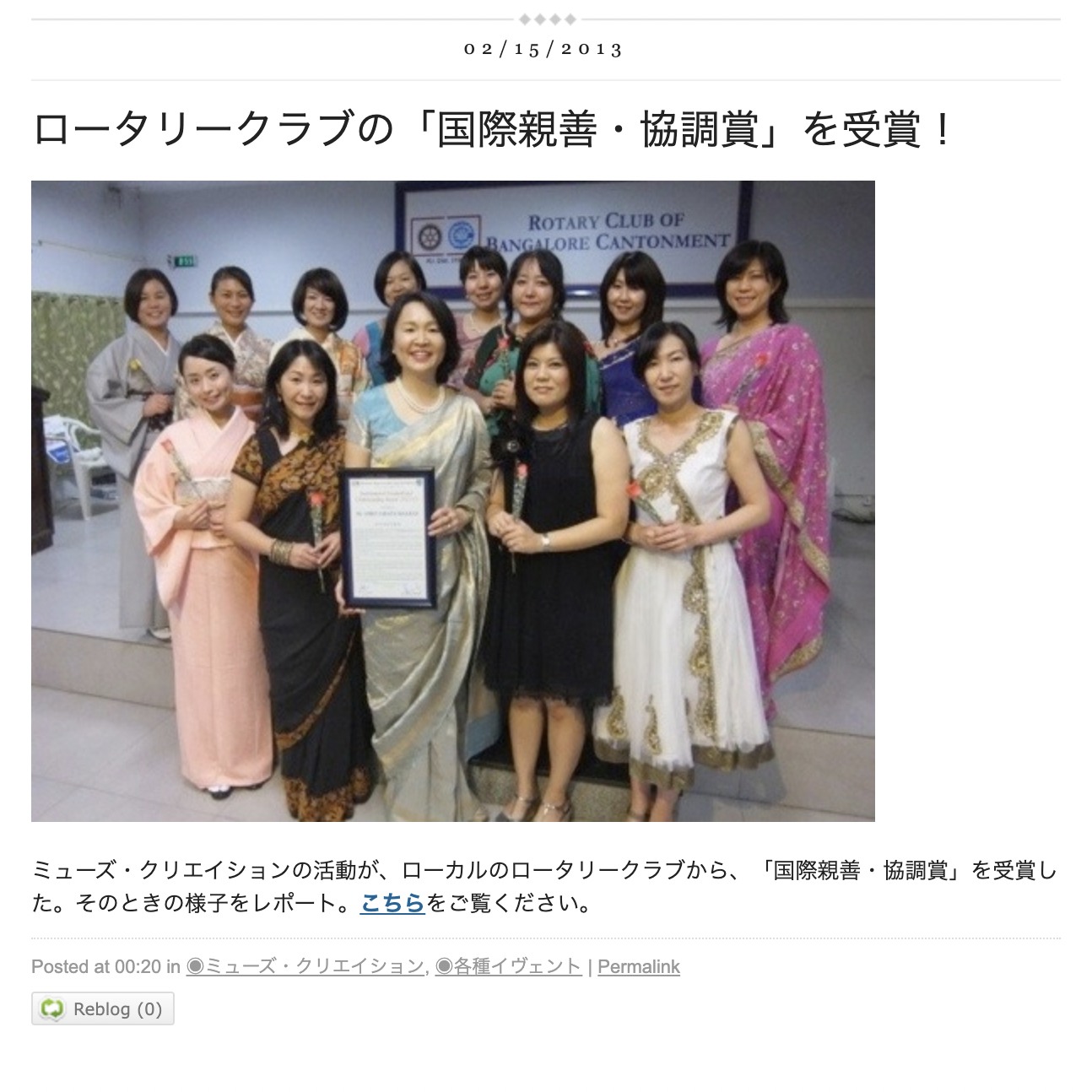 2013年には、地元のロータリークラブから、国際親善賞を受け、活動を評価していただいた。また同年12月には、来印されていた天皇皇后両陛下(現上皇上皇后両陛下)のご招待を受け、ミューズ・クリエイションの代表として、チェンナイで開催されたお茶会に出席させていただいた。皇后陛下とお言葉を交わす機会をいただいた際、簡潔にミューズ・クリエイションの活動をご説明したところ、「すばらしい活動ですね。がんばってください」とのお言葉をいただいた。心の底から励まされた。