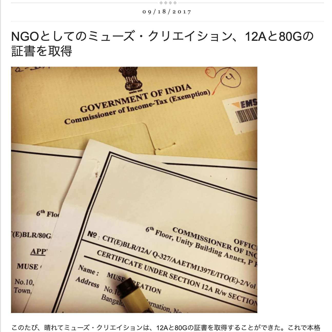 ◎NGO化した最大の理由は、ミューズ・クリエイションの銀行口座を設け、経理を詳らかにし、正しく納税申告をすることにあった。また将来、寄付金を受けることになった場合に備えて、12G及び80Gの申請を行なった。この手続きに際しては、Trust Deedの変更が必要となり、会計士や弁護士に再び依頼するなど、一筋縄ではいかないプロセスを経た。