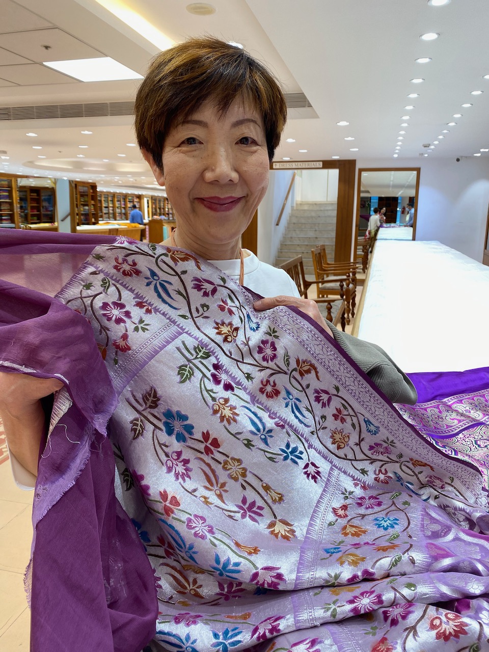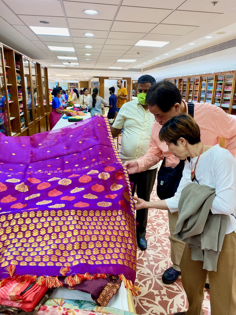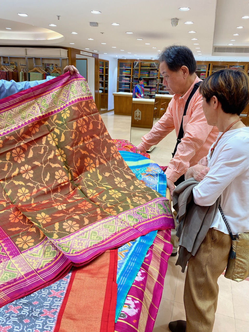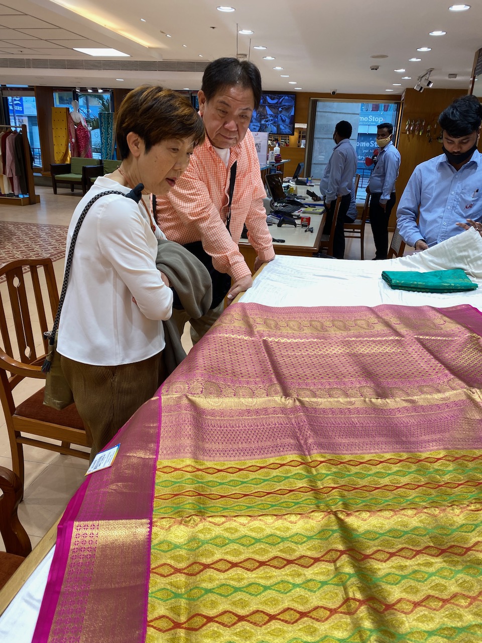 今回の京友禅サリー展示会のために、京都から来訪された竹鼻夫妻。「京友禅サリー」の発起人である「京都工芸染匠協同組合」の理事長、竹鼻進氏(タケハナ染匠)と美幸夫人のお二人をご案内した。