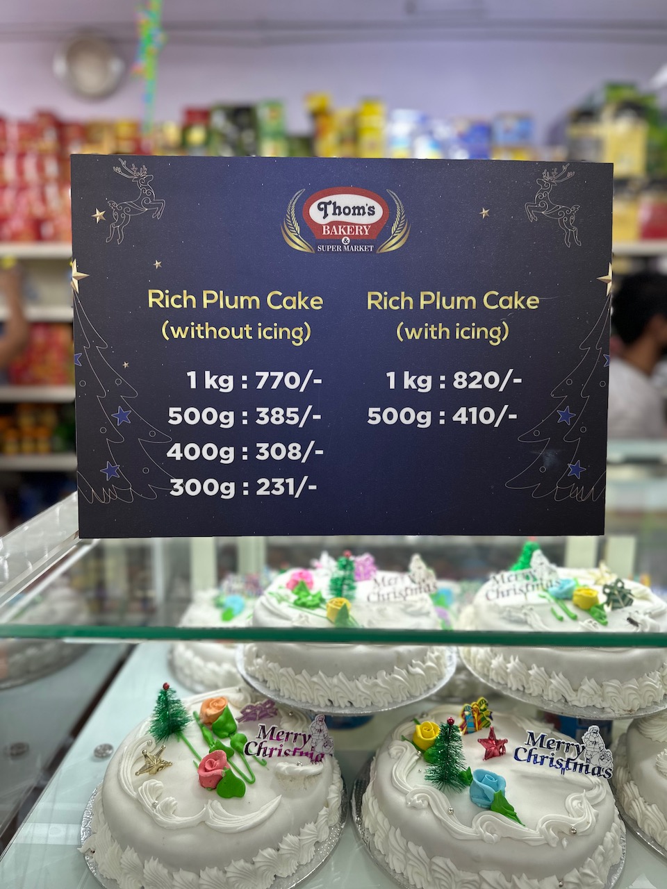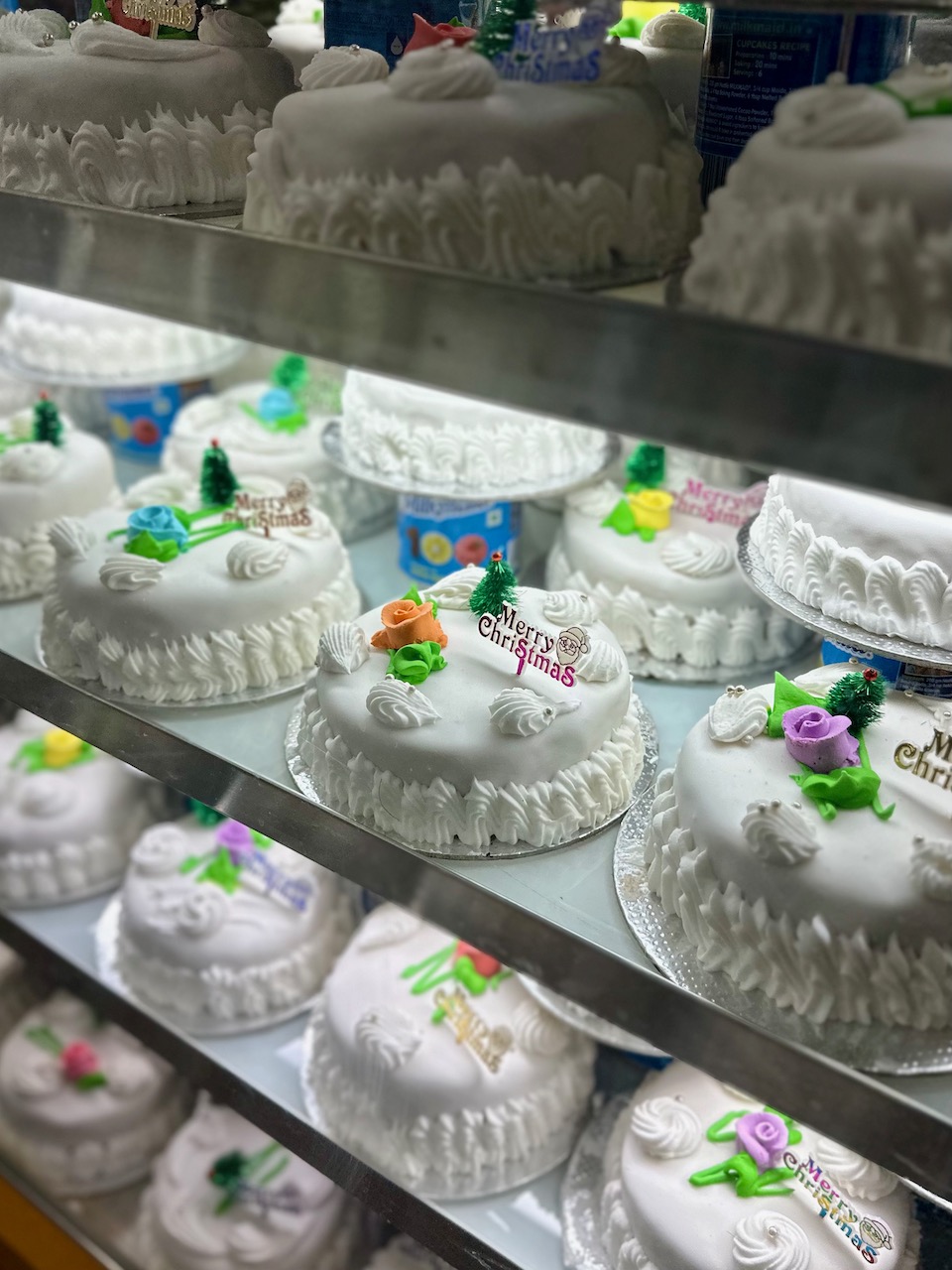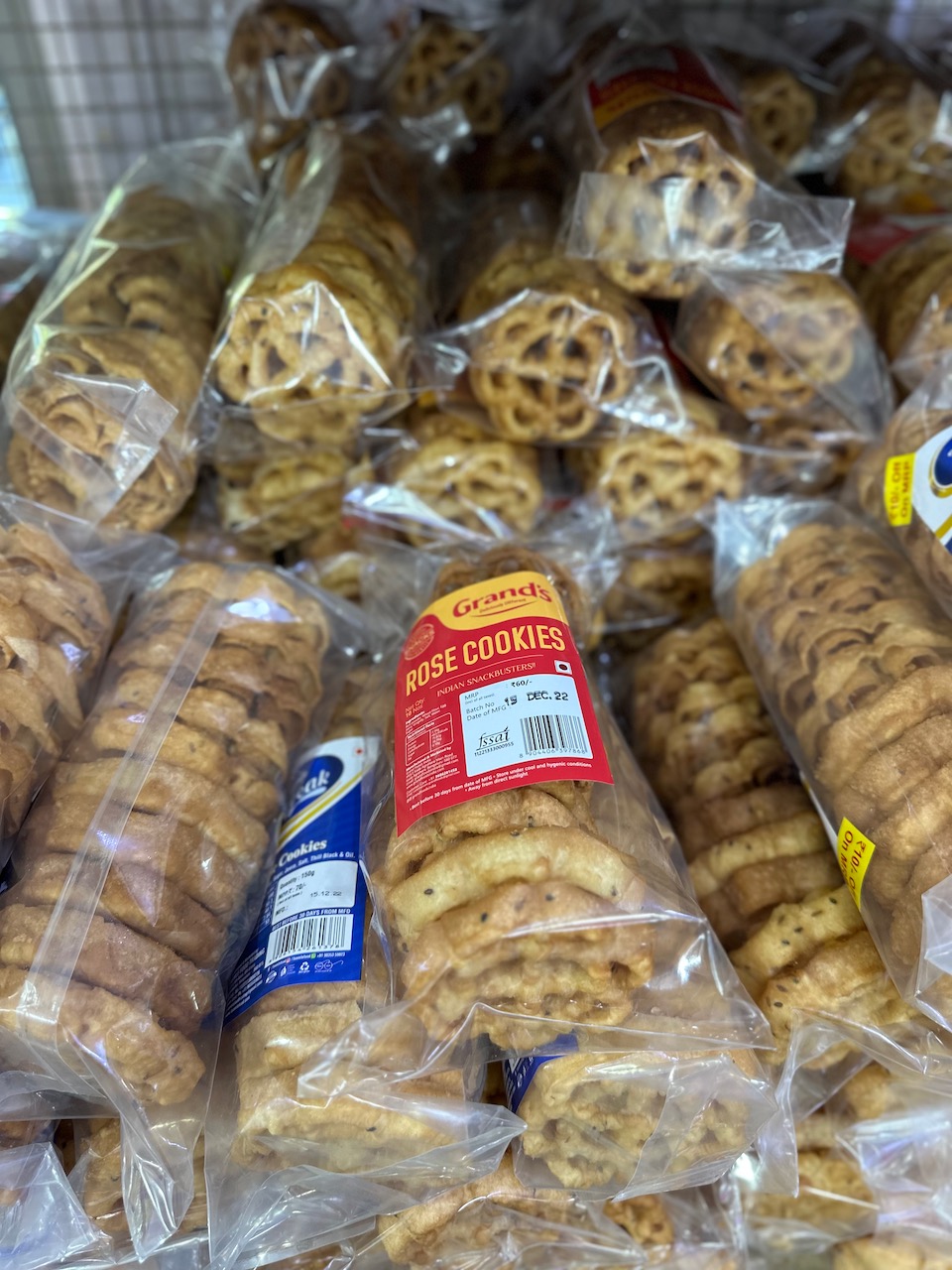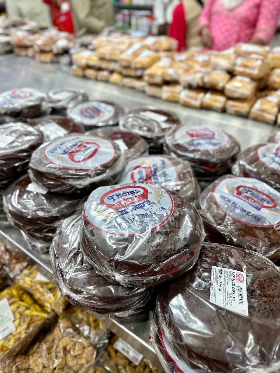 この界隈のクリスチャンにとって、クリスマスケーキといえば、この茶色いプラムケーキなのだ。ドライフルーツやナッツ類が入ったもので、ラム酒の風味が利いているものもある。このほか、クリスマスの時期に食べられるローズ・クッキーやKulKulsと呼ばれる菓子類なども山と積まれている。