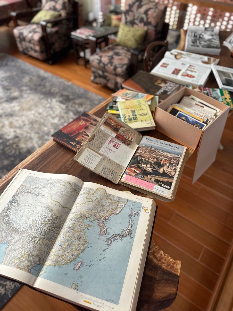 お二人ならば、我が家の「月光ライブラリ」がお気に召すだろうとご案内。わたしがモンゴル旅を決めたブリタニカの巨大な地図帳を見せたり、旅の記録や絵葉書、インドの手工芸関係の分厚く大きな事典などを見せると、感嘆して見入っていた。