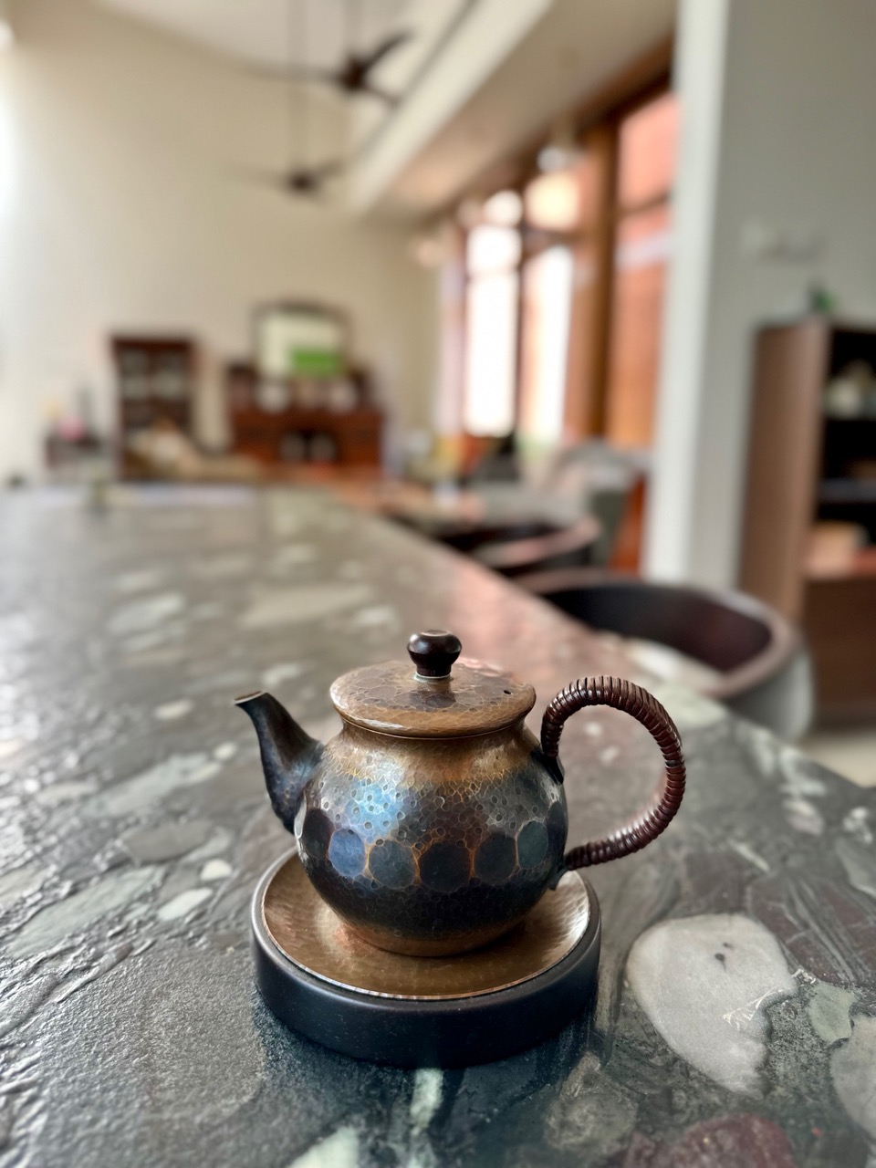 たとえば、我が家にある家具調度品。日本から持ってきた陶磁器、漆器類。あるいはサリーのテキスタイル。そういうものに関して「打てば響く」ように、反応が返ってくる。わたしが数年前の一時帰国時に、銀座で奮発して購入した新潟の「玉川堂(ぎょくせんどう)」(無形文化財 鎚起銅器)の急須を見せたところ、彼も、玉川堂とお仕事をされているとのこと。