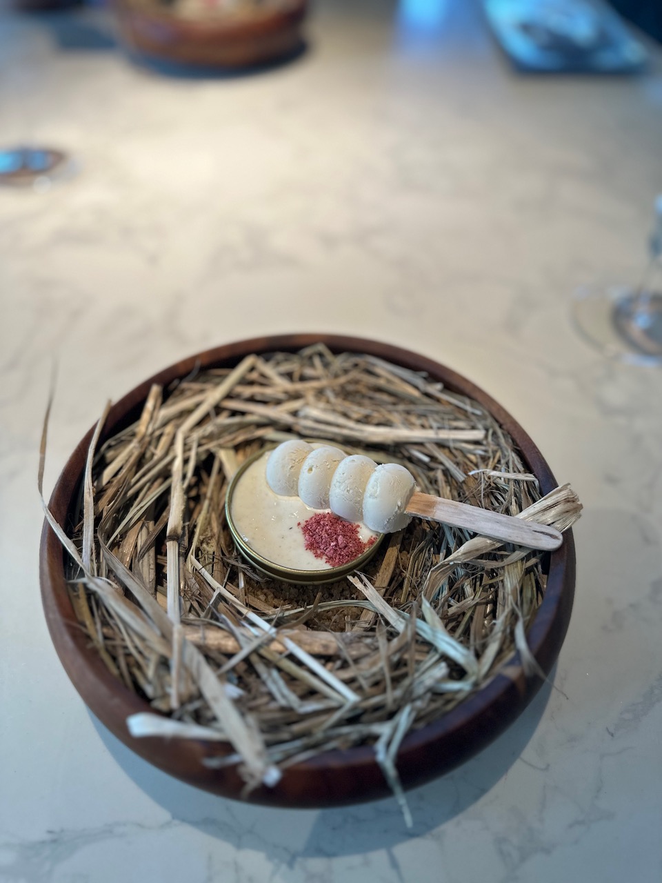 料理を供するたびに、シェフやスタッフが、丁寧に食材などを説明してくれる。それがまた、興味深い。この店もそうだし、ムンバイの名店、Masqueもそうだが、この実験的なキッチンは、かつてスペインのカタルーニャ地方にあった世界的に有名な前衛的レストラン、「エル・ブリ(エル・ブジ)」の流れをも組んでいると思われる。