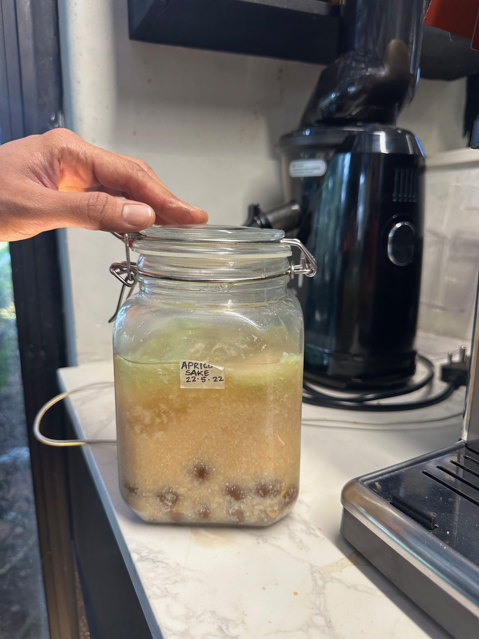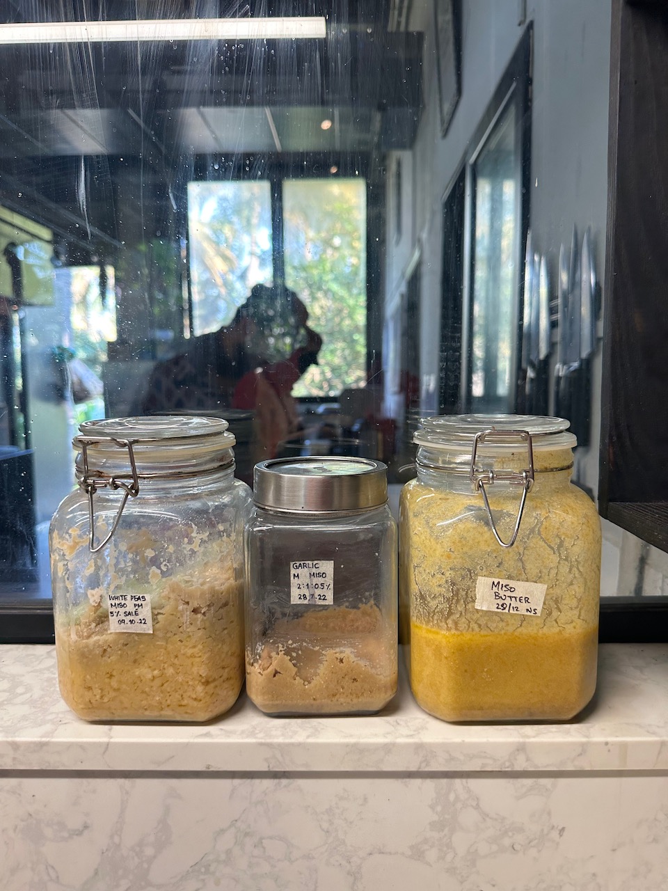食後、キッチンを見せてもらえたのが、とてもうれしかった。彼女が「実験的に」さまざまな素材から発酵している味噌を見せてもらう。先日の、Vegan Marketの記録でも紹介したBrown Koji Boyの味噌のことも、もちろん彼女は知っていた。