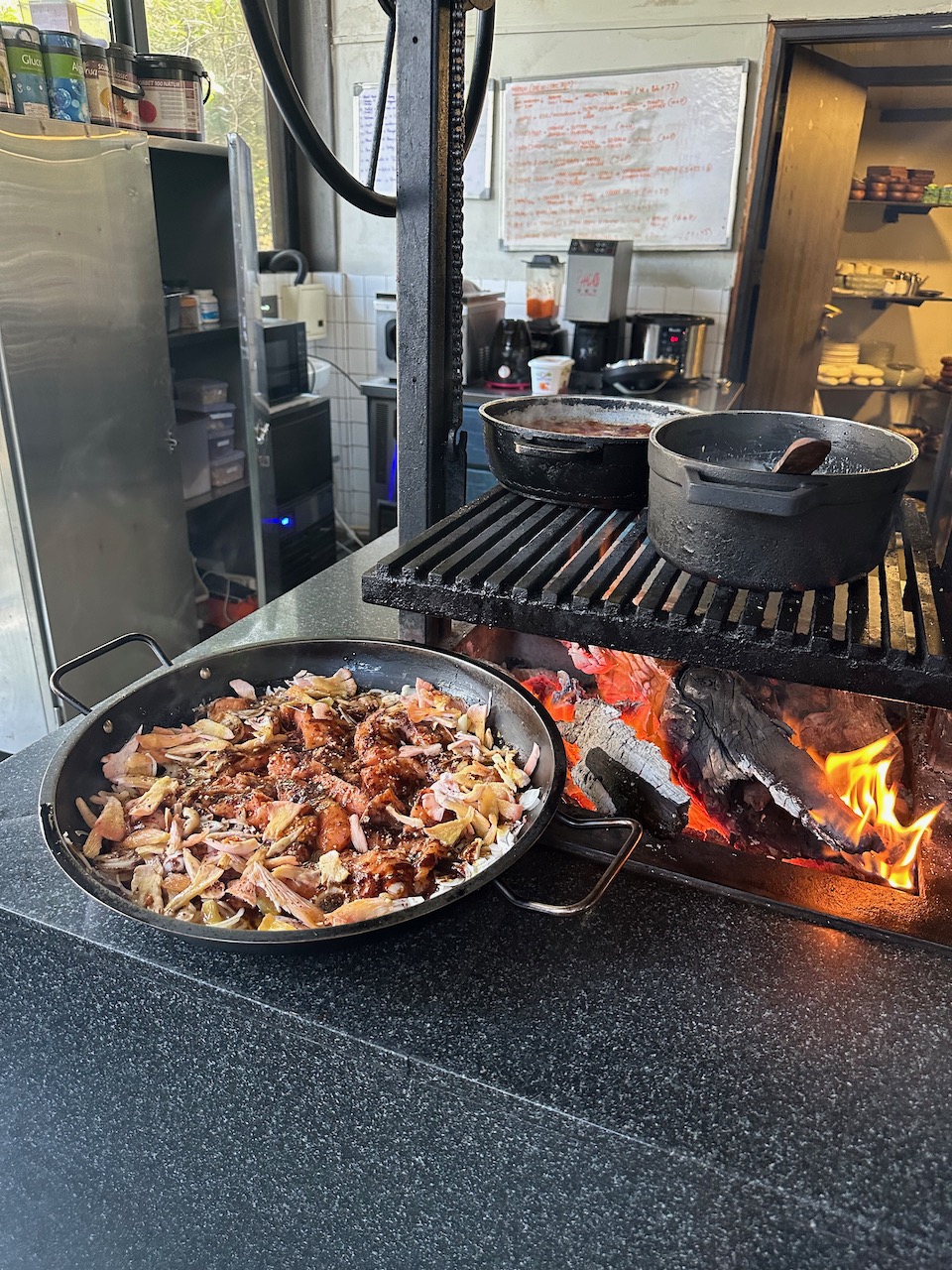 敢えて「原始的な」雰囲気のそのキッチンの、得も言われぬ魅力的な様子! 「まかない飯」のおいしそうなこと! 長時間の蒸し焼き料理にも使うという釜の燃料は、敷地内のマンゴーの木。……尽きない。
