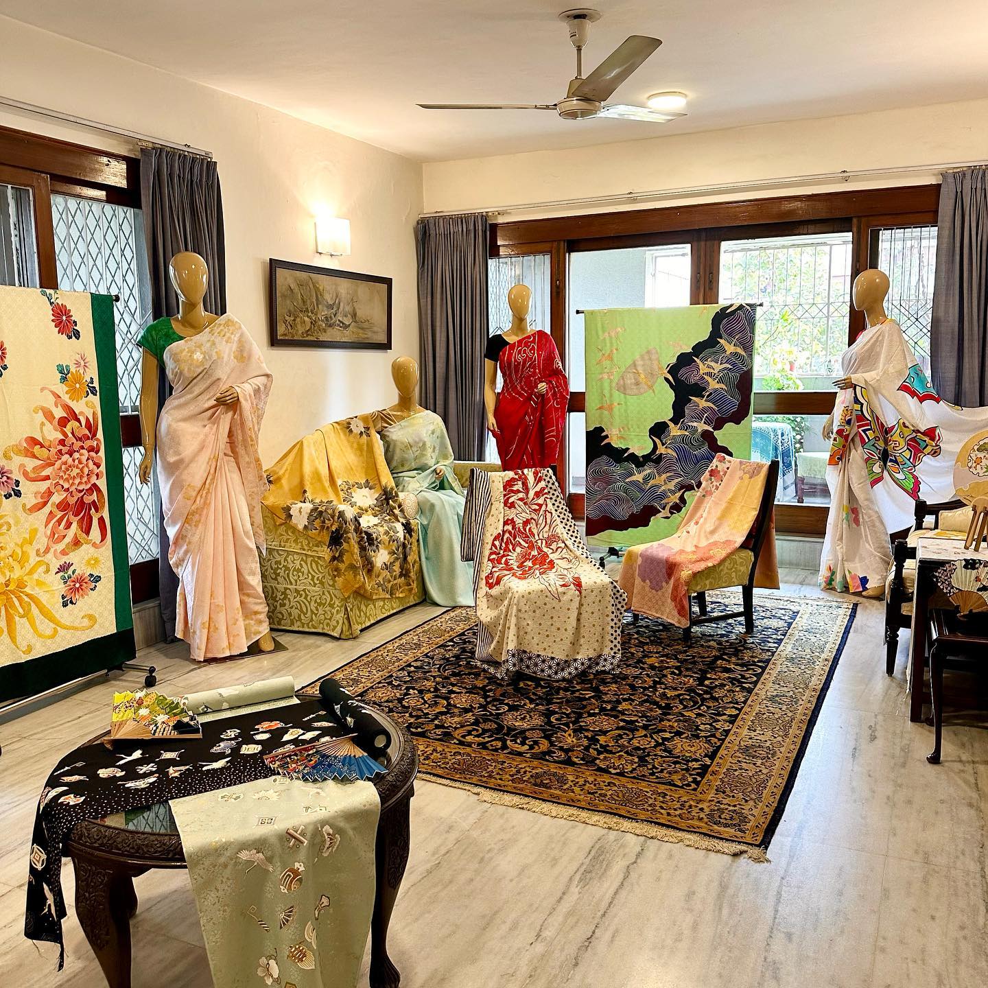 むしろ、家が地味だからこそ、サリーの美しさが引き立つ。テーブルクロスやクッションなどを購入するつもりだったが、むしろ展示会には不要だとセッティングをしたあと実感した。