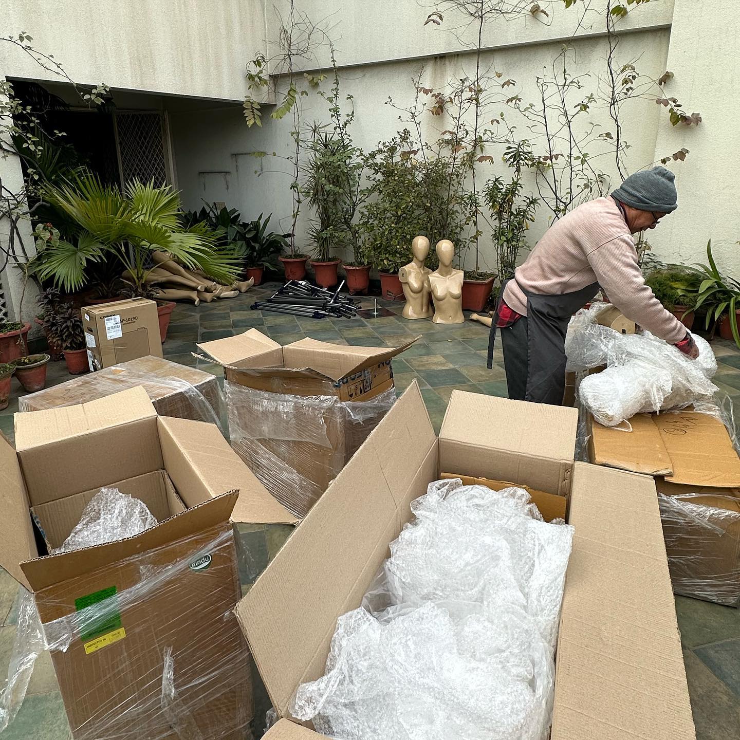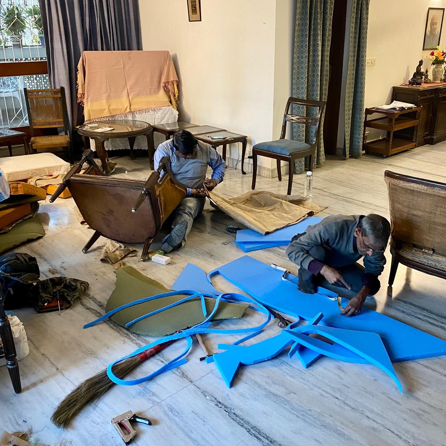 今回、京友禅サリー展示会の会場にするには、すべてがあまりに古びていて、殺風景であることが懸念だった。ソファーカヴァーだけ、2020年2月に来訪した際に張り替えておいてよかったと思う。上の2枚の写真はそのときのものだ。