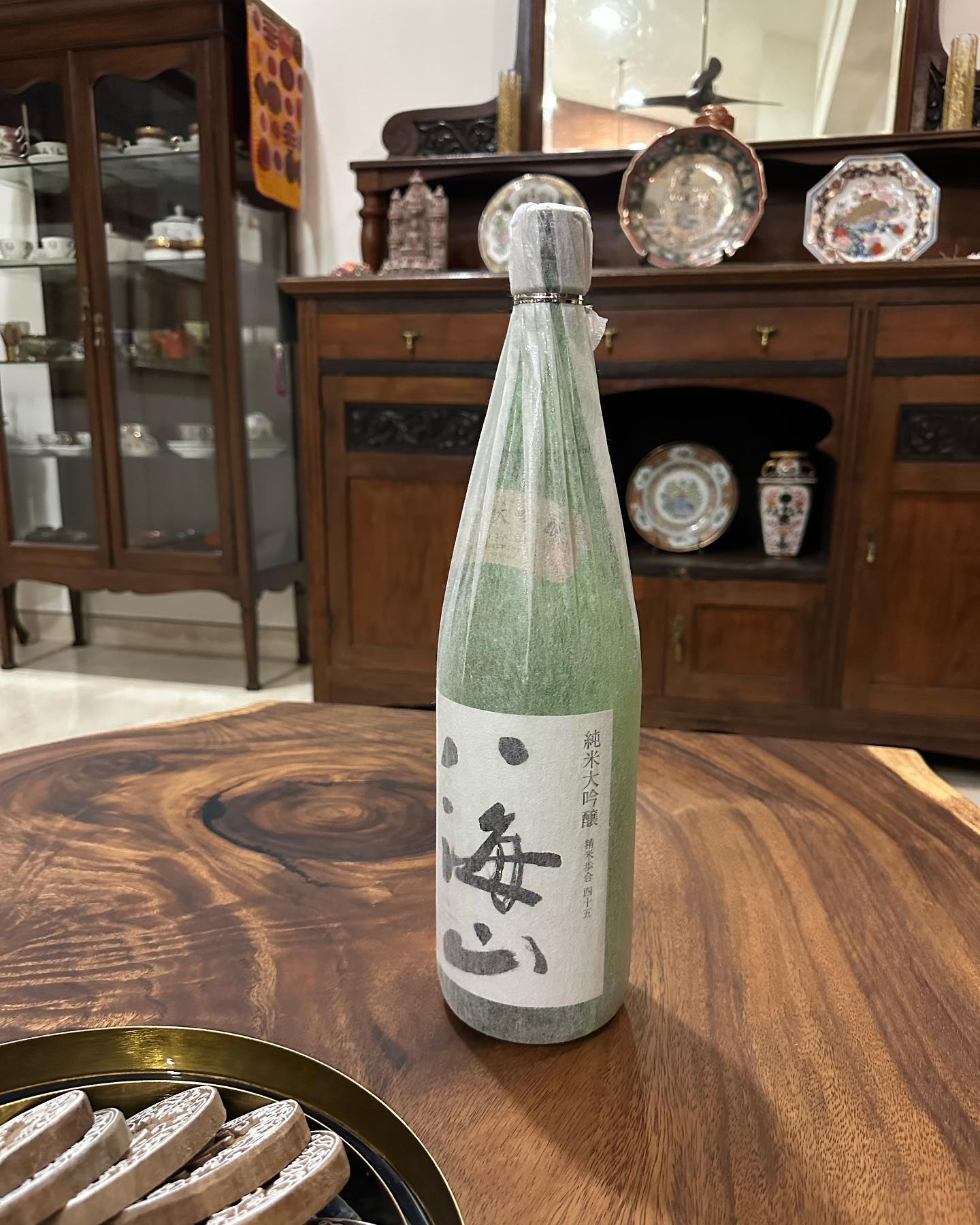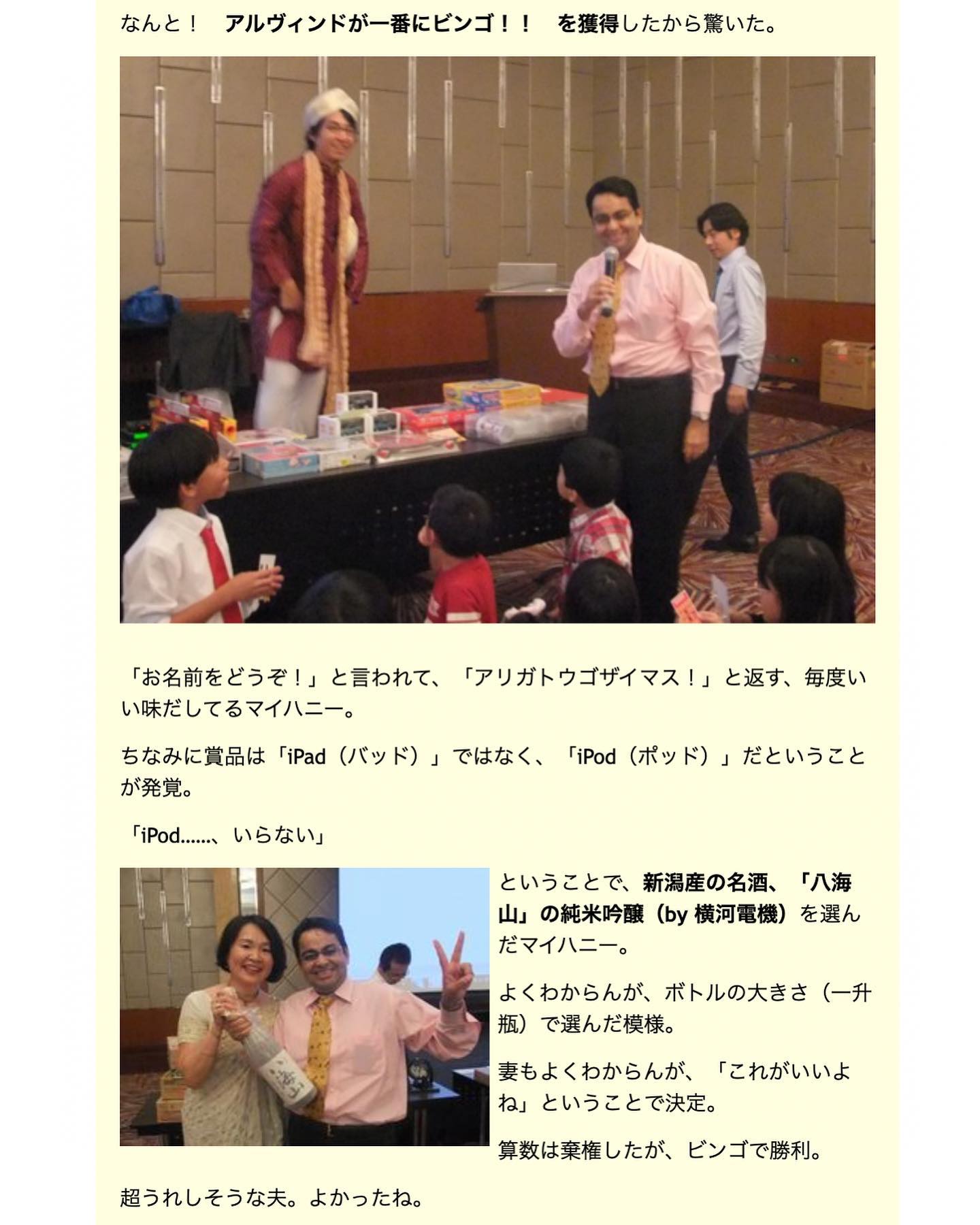 *たくさんのお土産に感激……! 日本人会のパーティのビンゴで、夫が獲得した思い出の「八海山」は、横河インディアからの提供だった。一升瓶が、たまらない!