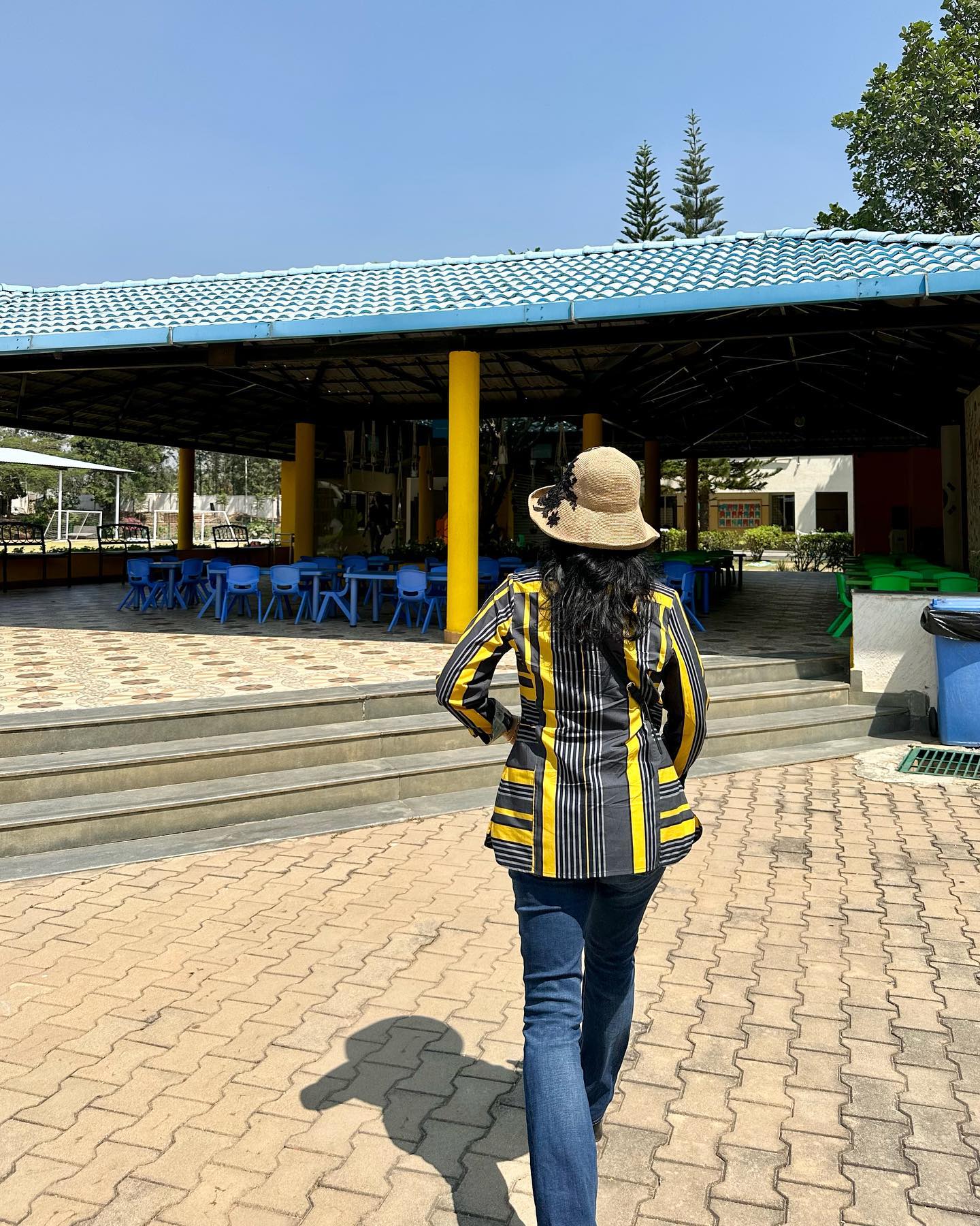 2時間近くものあいだ、ゆっくりと、学校内を巡った。わたしはといえば、校舎の色合い(青と黄色)とコーデされたファッションにて、記念の1枚。
