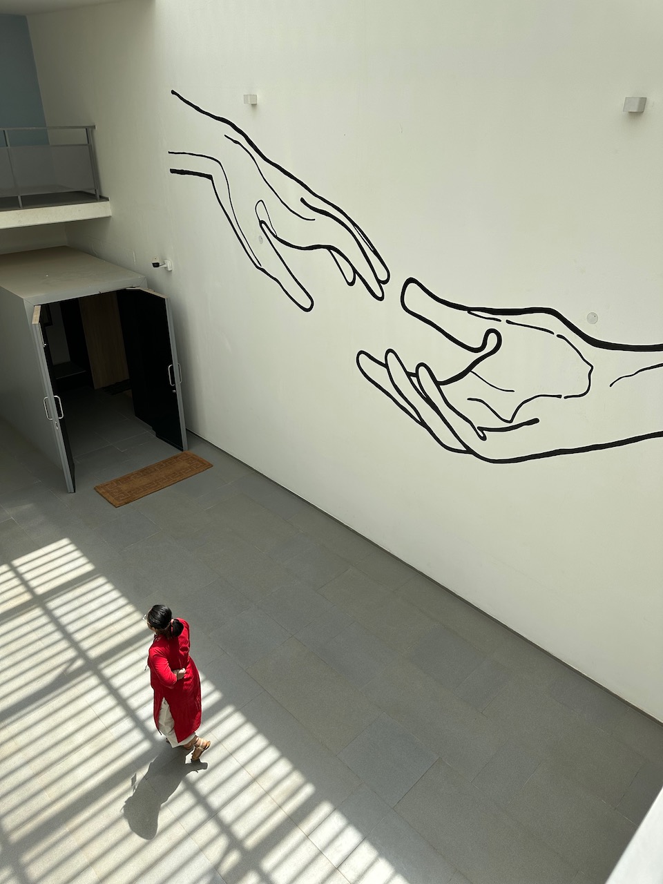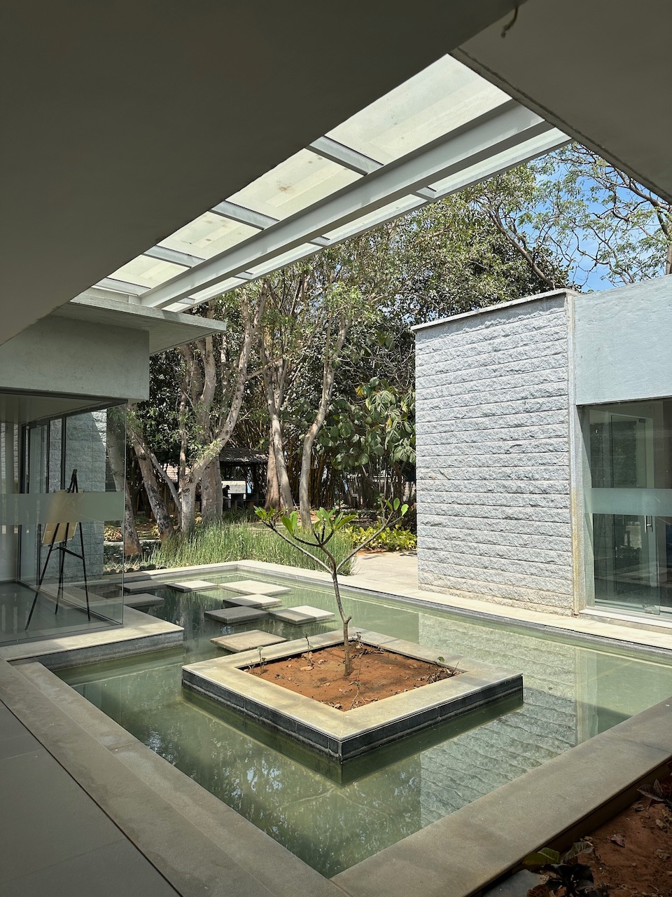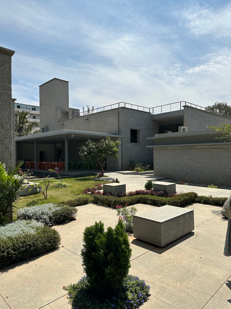 ⬆︎かつて庭だった場所に建築されていた新棟。リサーチセンターやライブラリ、オーディトリアム(ホール)などが併設されている。折しも、わたしたちが訪れた数日前に、この建築物が、‘Architect of the Year Award’を受賞していた。B’luru architect bags award for hospice trust’s project