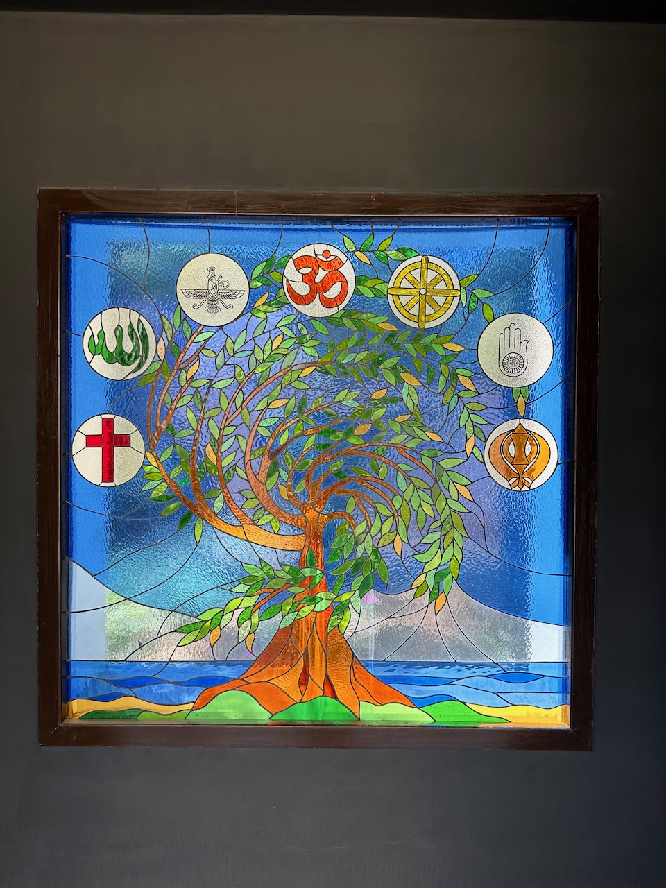 ⬆︎患者さんに近い人たちの心を安らげるために作られたという場所。キリスト教、イスラム教、ゾロアスター教、ヒンドゥー教、仏教、ジャイナ教、スィク教のシンボルが施されたステンドグラス。