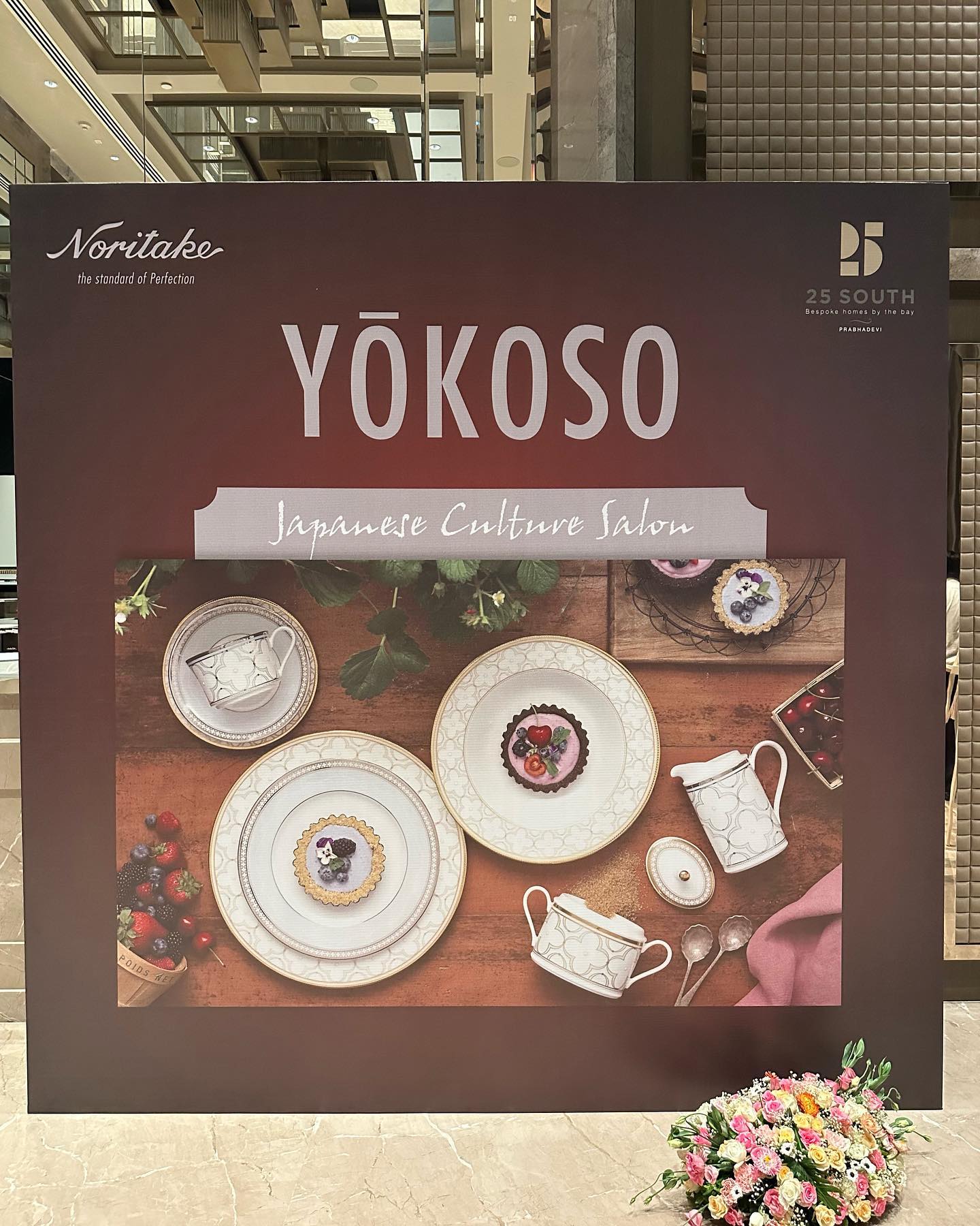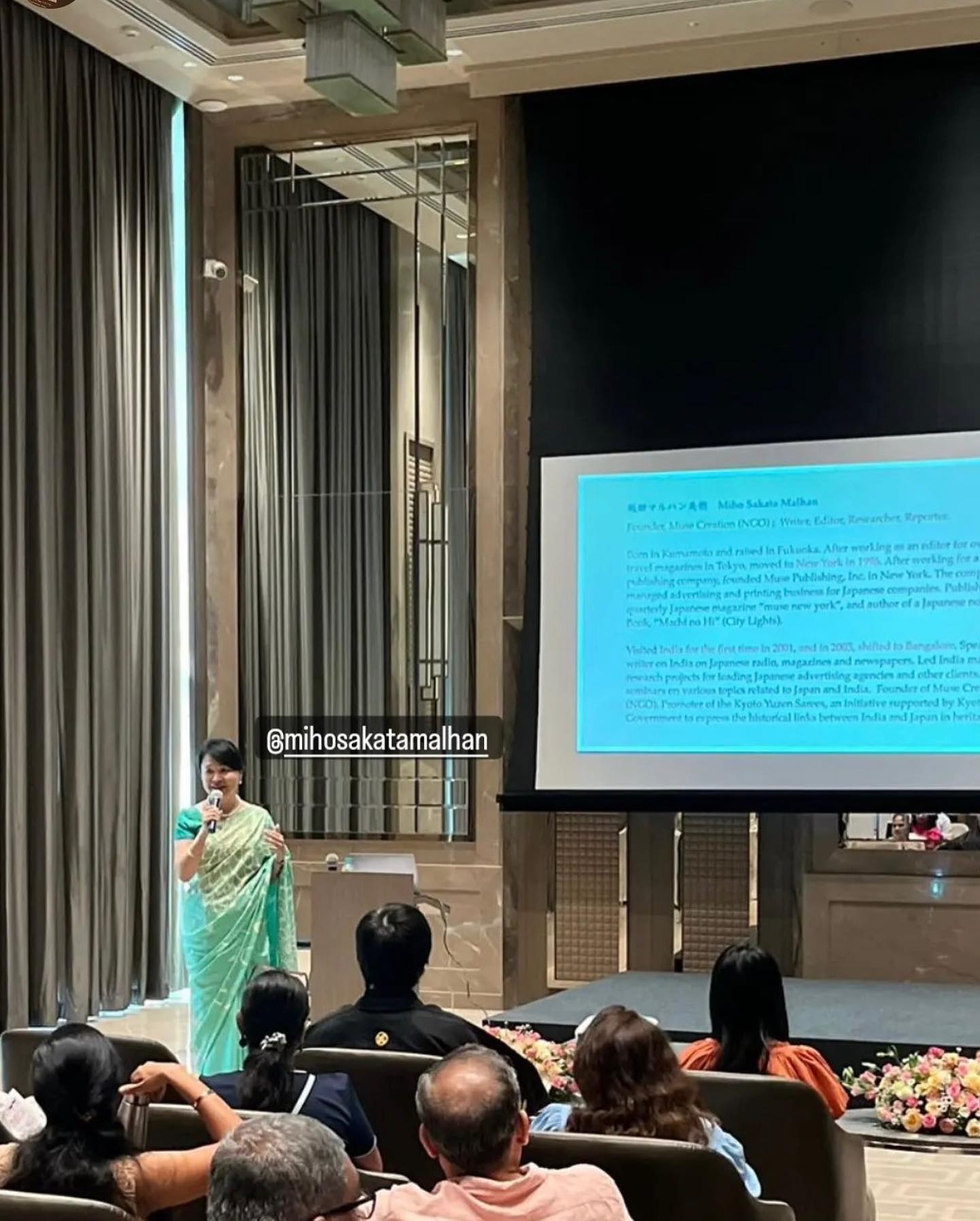 今回は、ムンバイで現在、建築中(一部完成)のラグジュアリーな高層アパートメントビルディング「25 SOUTH」で開催された、居住者や顧客向けの催し “JAPANESE CULTURE SALON” にスピーカーとして招かれた。世界的に有名な日本の陶磁器ブランド「ノリタケ」との合同イヴェントだ。会場には主賓として、在ムンバイ日本国総領事館の総領事、深堀氏も紋付羽織袴姿でお見えになった。場の雰囲気が「日本!」になり、とてもすてきだ。わたしは、毎度おなじみ、京友禅サリーを着用して参上だ。