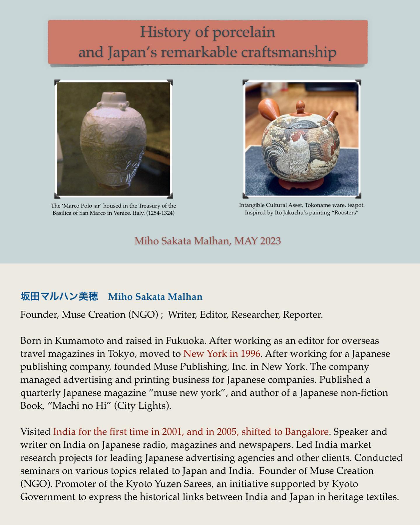 先月の一時帰国時に撮影した京都の情景や、伝統工芸品の写真を多用しつつ、日本の「匠の技」のすばらしさを伝え、同時に日本や中国、欧州の陶磁器の歴史的背景を語る。