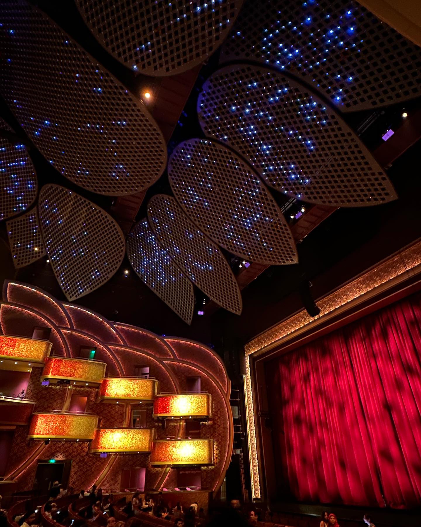 シアターは、想像していた以上に見事な設備だった。本場のブロードウェイのシアターは、昔ながらの雰囲気がよい一方、設備は古く、シートが窮屈なところが多い。しかし、このシアターはシートの座り心地もよく、ホール全体のレイアウトも開放感があって、非常にいい「気」が漂っている。観劇しやすい環境だ。