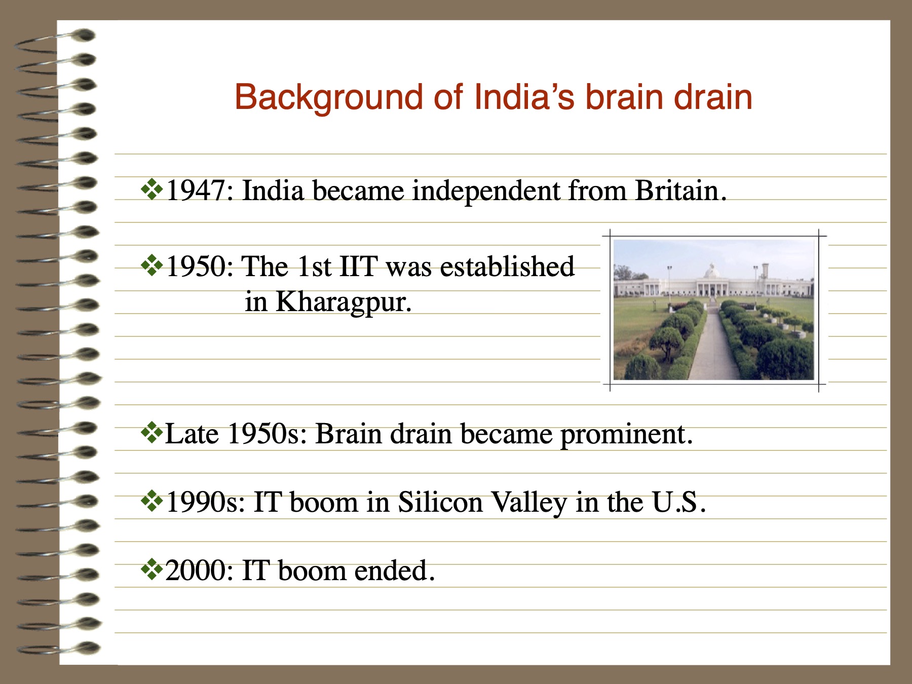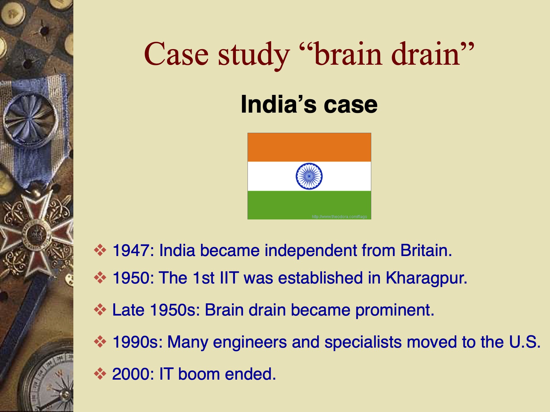 1947幎ãè±åœããç¬ç«ããŠä»¥æ¥ãã€ã³ãã¯ãé è³æµåº(brain drain)ããšããæ·±å»ãªçŸè±¡ã«çŽé¢ããŠããããé è³æµåºãšã¯ãé«åºŠãªæè¡ã身ã«ã€ãã人æãæ¯åœãé¢ããããé«åå ¥ãåŸãããåœãžç§»ãçŸè±¡ãããã (Longman Dictionary)ã1950幎代ã®åŸåããèµ·ããå§ããé è³æµåºã«ãããã€ã³ãã¯é«åŠæŽã®åªç§ãªäººæããç±³åœãäžå¿ãšããå é²è«žåœã«ã茞åºããç¶ããŠããã