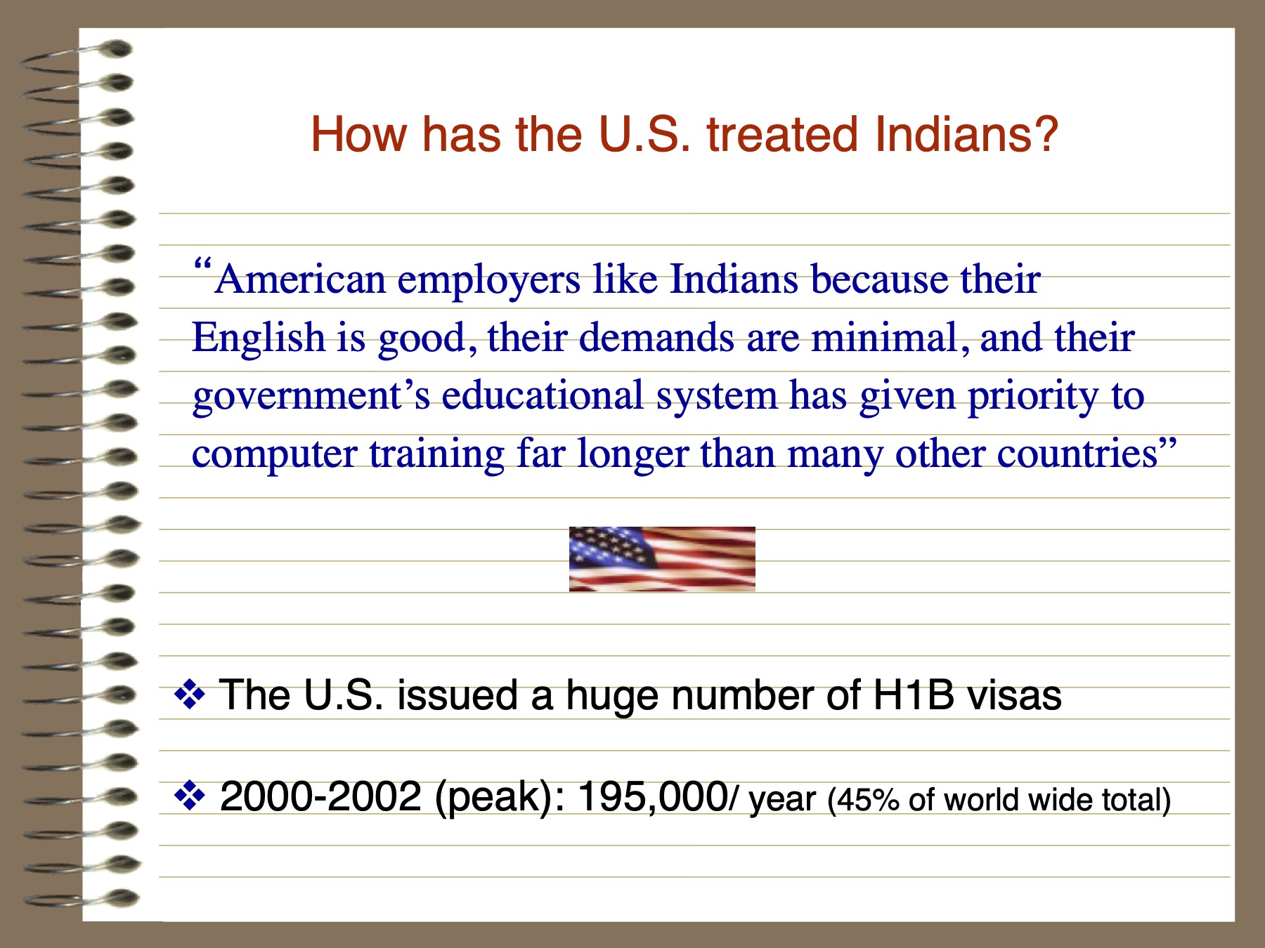 ãæ¯å¹ŽãäžçäžããäœçŸäººãäœå人ãã®äººã ãç±³åœã®å°±åŽãã¶ãç³è«ããããç±³åœã®éçšè ã¯ã€ã³ã人就åŽè ã«å¯Ÿã奜æçã ããªããªã圌ãã¯è±èªã話ããããèŠæ±ãå°ãªããæŽã«æ¯åœã®é«åºŠãªæè²æ©é¢ã®ãããã§ãä»ã®åœã®äººã ãããåªããã³ã³ãã¥ãŒã¿ã«é¢ããæéã身ã«ã€ããŠããã (Constable A23)ã