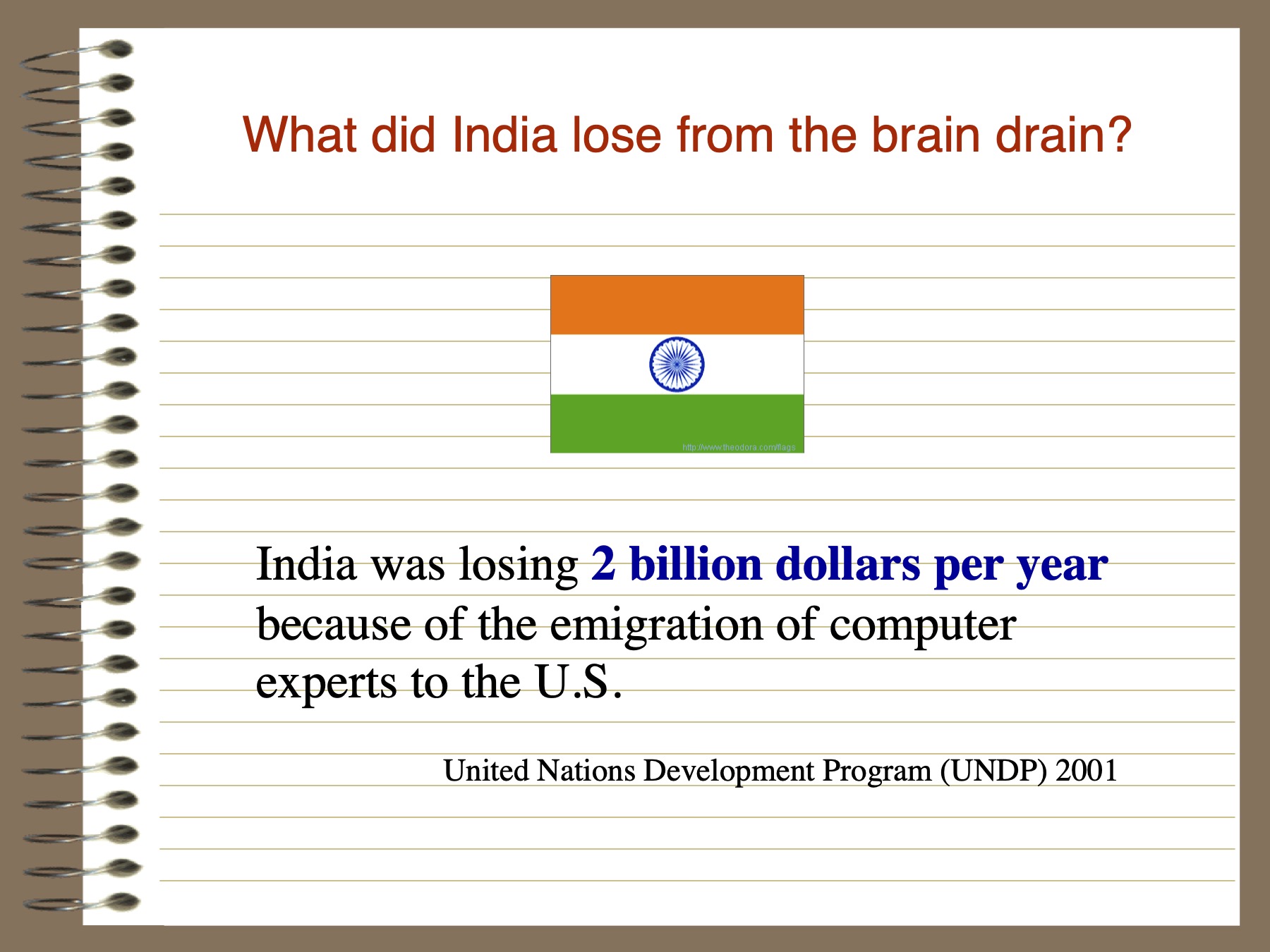 2001幎ã«çºè¡šãããåœé£éçºèšç»ïŒUNDPïŒã®å ±åã«ãããšãã€ã³ãã¯ã³ã³ãã¥ãŒã¿æè¡è ã®ç±³åœãžã®é è³æµåºã«ããã幎é20åãã«æå€±ã被ã£ãŠãããšãã(BBC News)ã