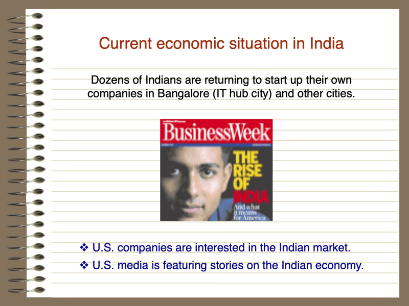 å ããŠ2003幎ã®12æ8æ¥ã«çºè¡ãããããžãã¹ãŠã£ãŒã¯ãã¬ãžã³ã¯ãThe Rise of India [ã€ã³ãã®å°é ]ããšããç¹éãçµã¿ãçŽ10ããŒãžã«äºã£ãŠãã€ã³ãçµæžã®çŸç¶ãšå°æ¥ã®èŠéãããäžéšãäžåœçµæžãšãã®ããã¯ã°ã©ãŠã³ããšæ¯èŒããªããåæã»ç޹ä»ããŠããã