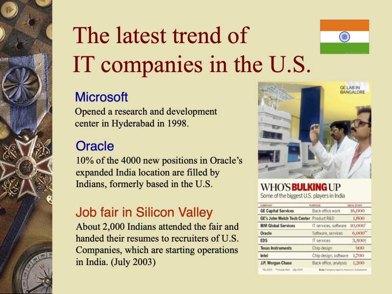 ããæ°å¹Žãç¡æ°ã®ã€ã³ã人æè¡è ã¯ç±³åœãå»ããæ¯åœã§èµ·æ¥ãå§ããŠããããããšåæã«ç±³åœã®äŒæ¥ãã€ã³ãåžå Žã«çç®ãã¯ãããããæè¿ãæµ·å€è³æ¬ãååŒäºæ¥ãåªéããæ¹åã§ãã€ã³ãã®ããžãã¹æ³ãèŠçŽãããããšã«ããã1998幎ã«ç±³ãã€ã¯ããœãã瀟ãã€ã³ãã®ãã€ãã©ããŒãã«ç ç©¶éçºã»ã³ã¿ãŒãéèšããã®ãå§ããå€ãã®ç±³ITäŒæ¥ããã€ã³ãé²åºãç®è«ãã§ããã(Constable A23)ã