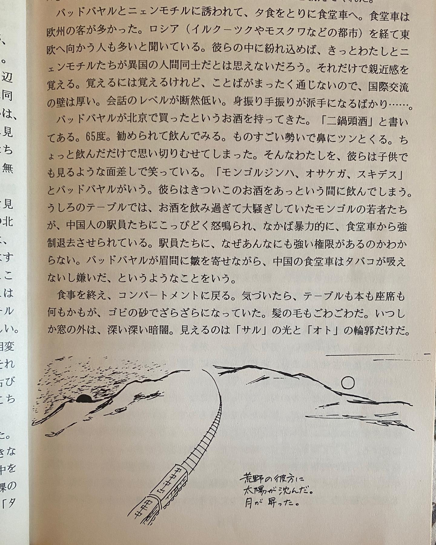 ◎ゆえに、26歳のときには休暇を利用して、北京からウランバートル(モンゴル)まで36時間の列車旅を決行した。28歳のときには、3カ月間、欧州を列車で旅した。ニューヨークで夫と出会ってからも、夫を連れて(!)、ベルギーを一周ドライヴしたり、スペインのアンダルシアからポルトガルまでドライヴしたり、あるいはローマからバルセロナまで地中海沿岸を列車で旅をしたりと、線の旅を重ねた。インドに移住する直前の数カ月間、カリフォルニアに暮らすことが決まった時には、米国東海岸から西海岸まで、アメリカ大陸を横断した。約6300kmのドライヴだった。