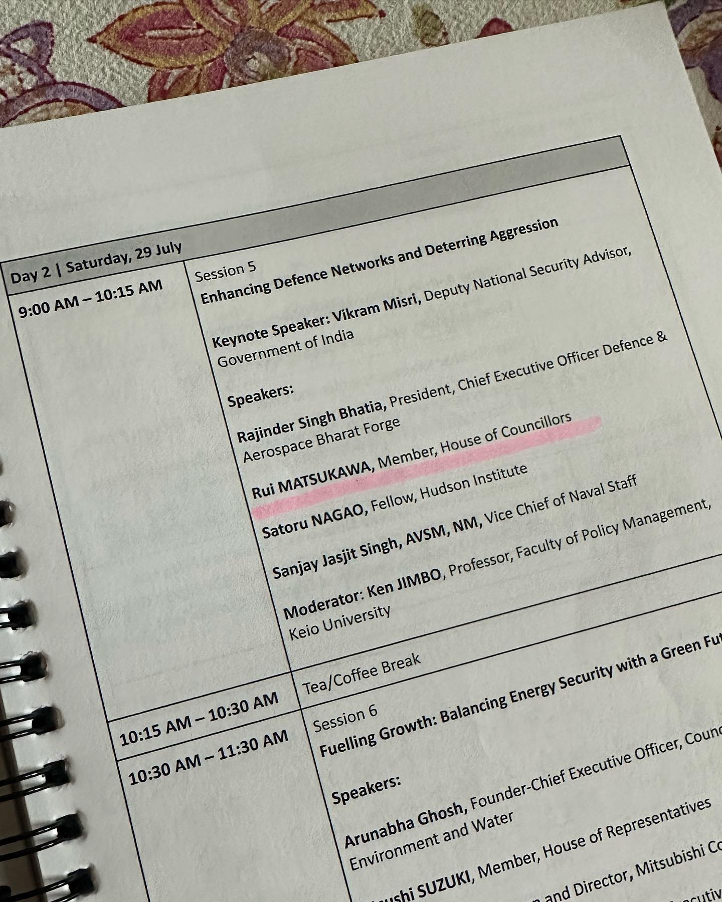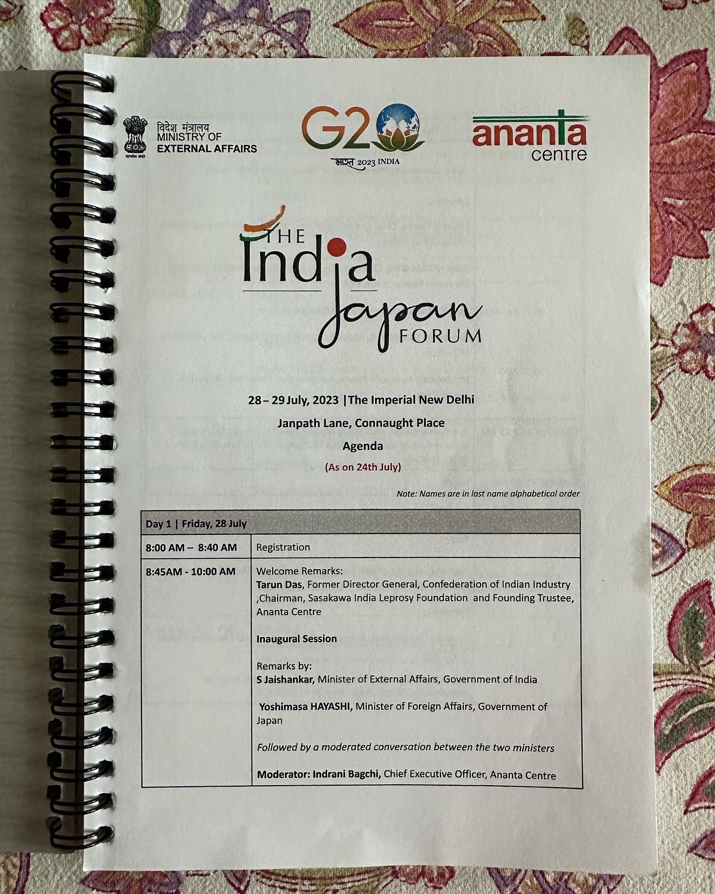 インドのジャイシャンカル外務大臣や日本の林芳正外務大臣をはじめ、両国の政治、外交、ビジネス、シンクタンクなどのエグゼクティヴ、メディア関係者や国際機関のゲストなど、約70名ほどの限られた人たちが参加するクローズドの催しだった。そんな中、わたしが参加できたのは、Arvindが主催者側であり、7つのセッションのうちの1つにて、彼がモデレータを務めることから、わたしもインドで活動するライター/NGO主宰者として招待された。