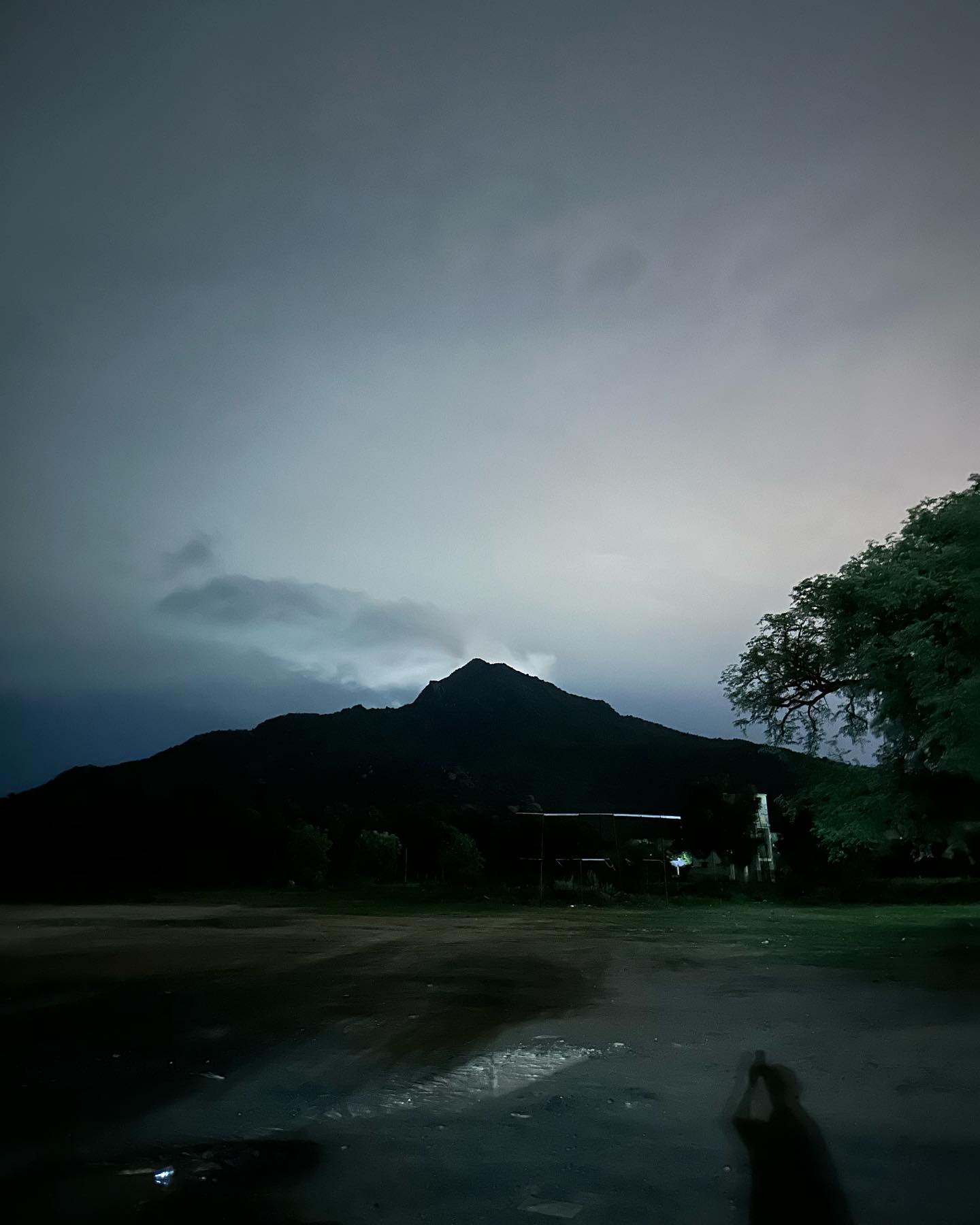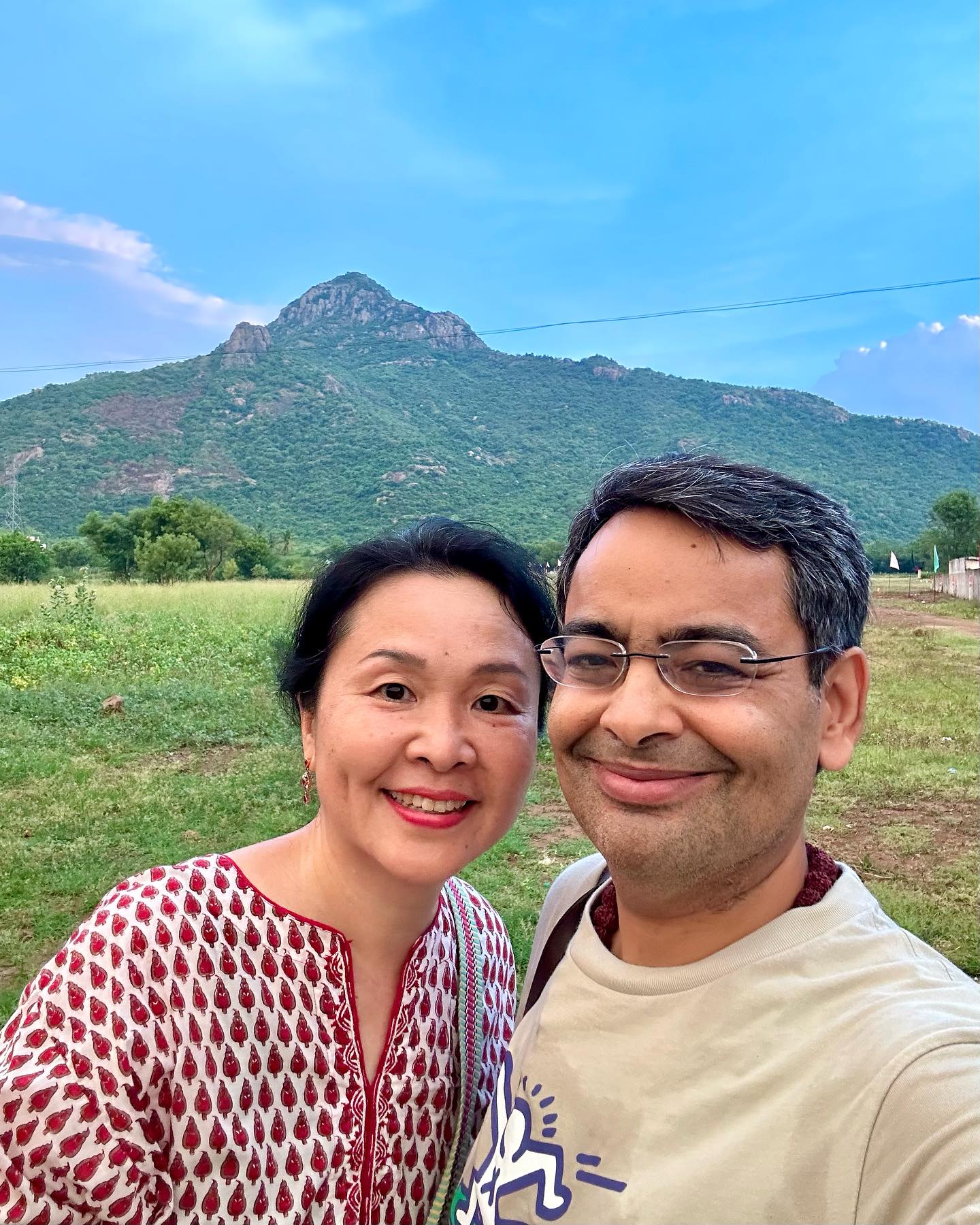 叡智の丘、とも呼ばれて来たアルナーチャラ。日本語では「霊山」と表現するのがふさわしいであろう、山の麓にて。わたしと夫が、こんな風に、わたしの誕生日を祝する日が来ることになろうとは、4、5年前には想像もしなかった。