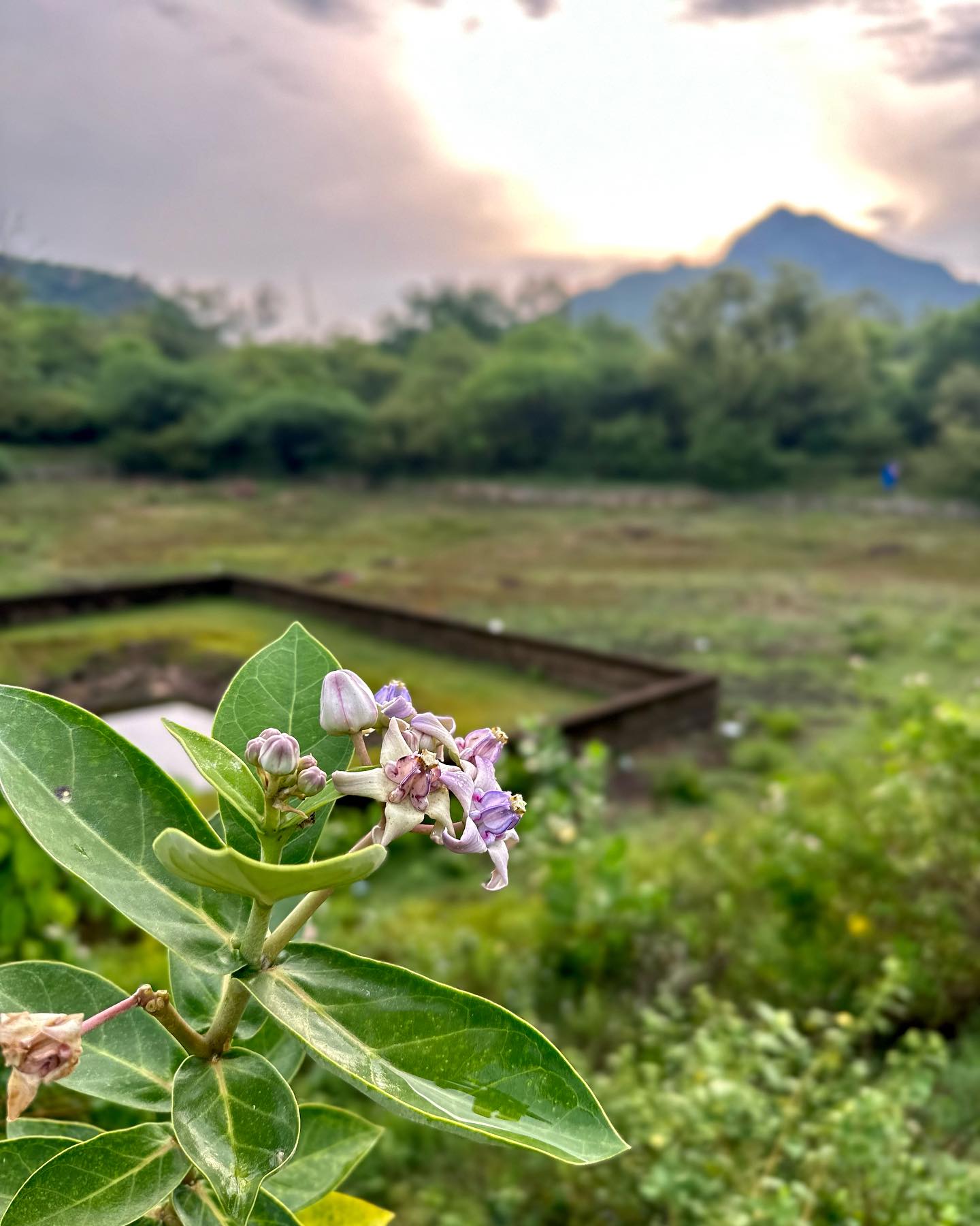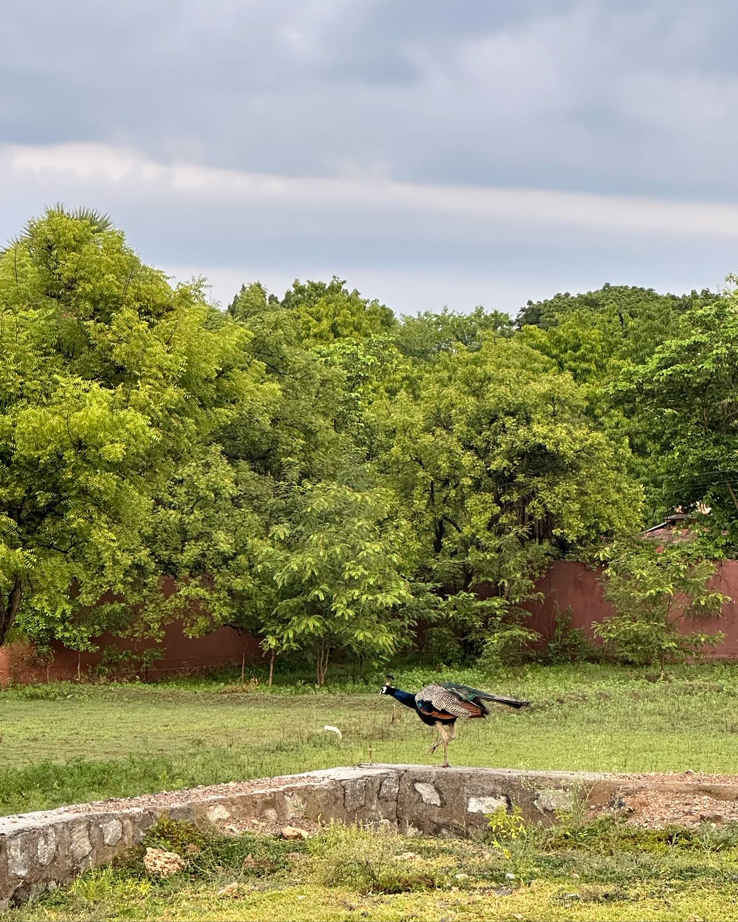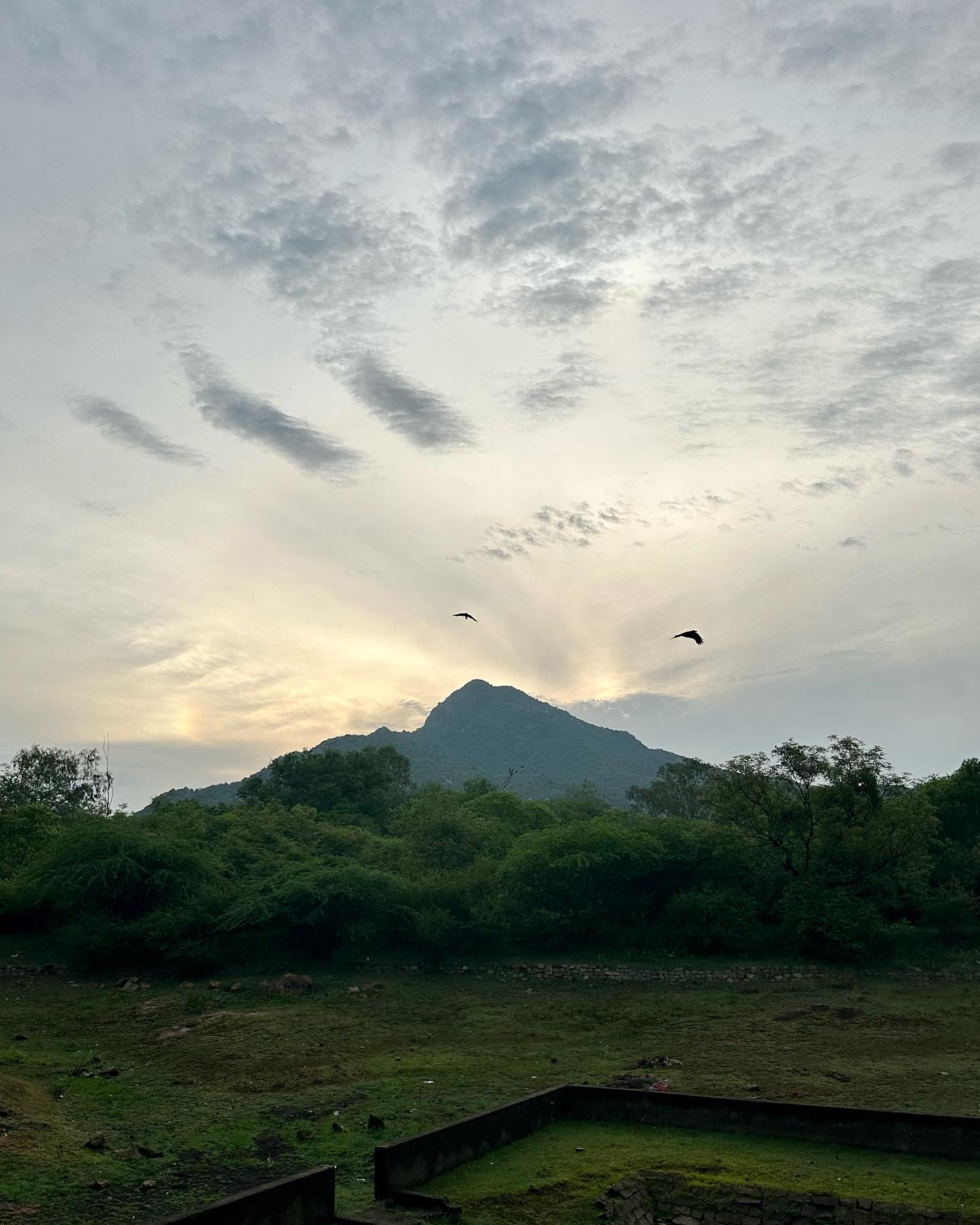 疲労困憊で眠りについて、目覚めれば夜明け前。早寝早起き。アルナーチャラ山を望む孔雀の広場で、日の出を見たくて起き上がる。夫とともに、8月31日の、やわらかな日昇を眺める。