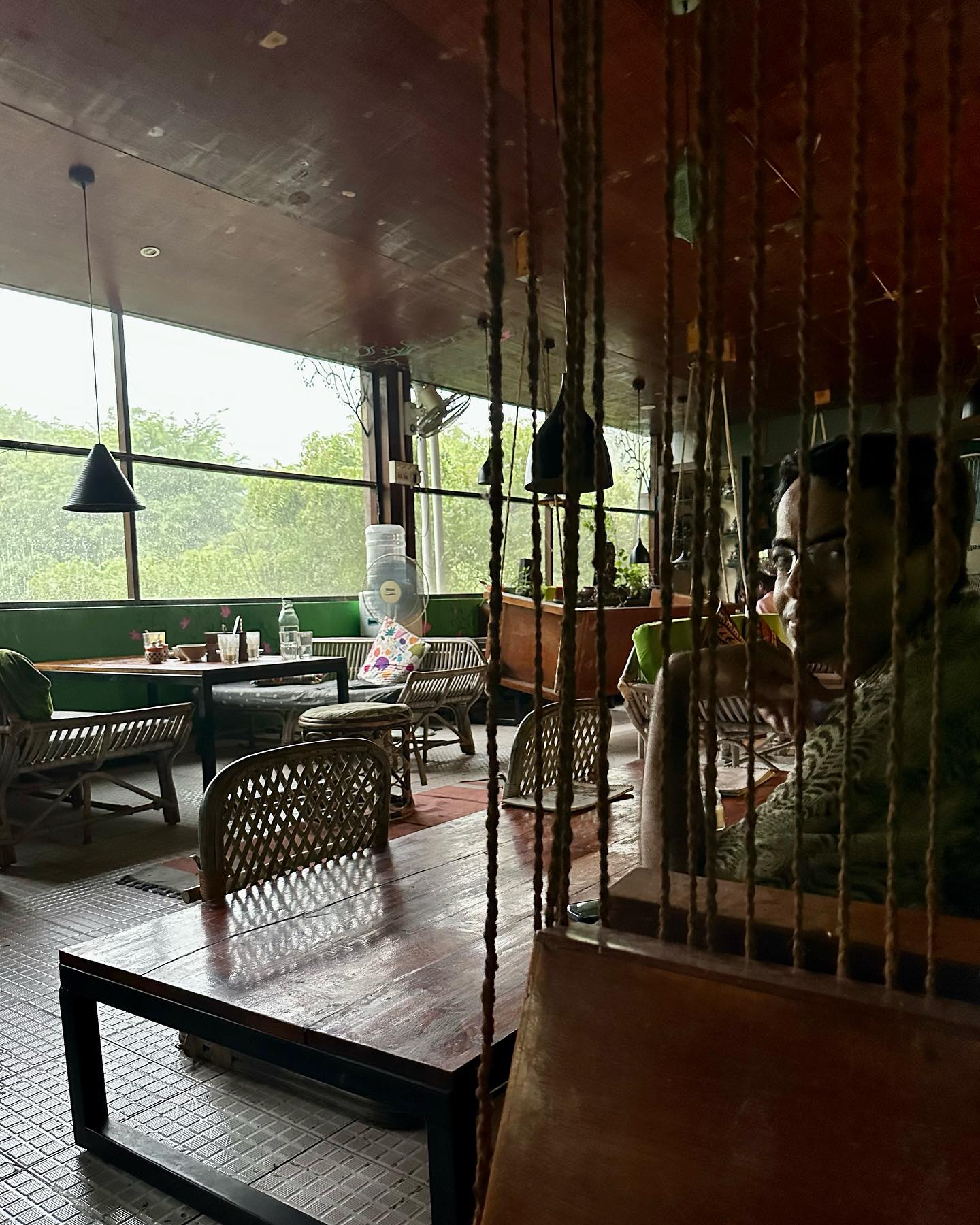 ランチを取ろうと、Googleで飲食店を検索。選んだその店、通された席は、アルナーチャラ山を眺める心地よい場所。ここでしばらく過ごそう。ランチだが、卵が食べたくなってマッシュルームとほうれん草のオムレツを注文。おいしい。