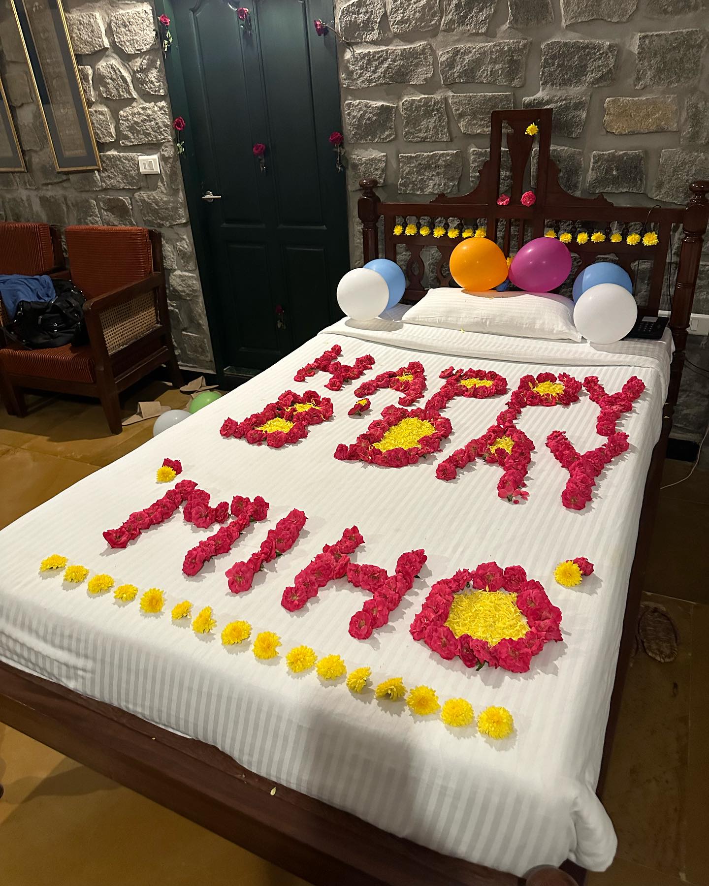 雨が小降りになったころ、オートを呼んでホテルに戻った。ホテルの部屋は、精一杯の祝福で迎えてくれた。ケーキにはフルネーム。夫とわたし、一口ずついただいて、あとはスタッフのみなさんに託した。