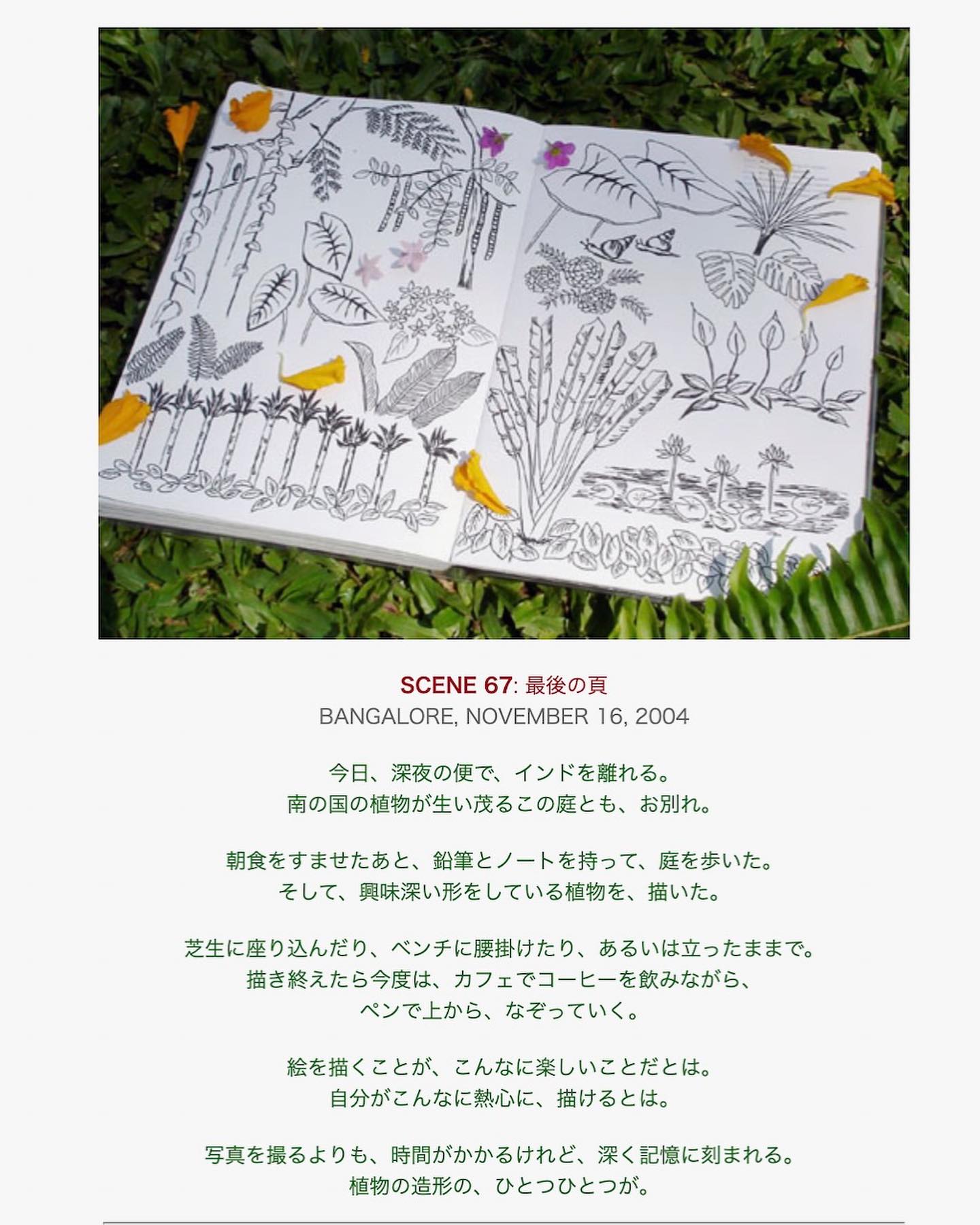 最後のページは、ブログの記録とリンクするもの。最初にノートに書き留めて、のちにブログに記す……という段取りは、今も当時も変わらない。朝食のあと、ホテルの庭を歩いて、植物を描いたときのことを、ついこの間のことのように思い出す。ノートを覗き込んだホテルのスタッフに褒めてもらった瞬間のことも。