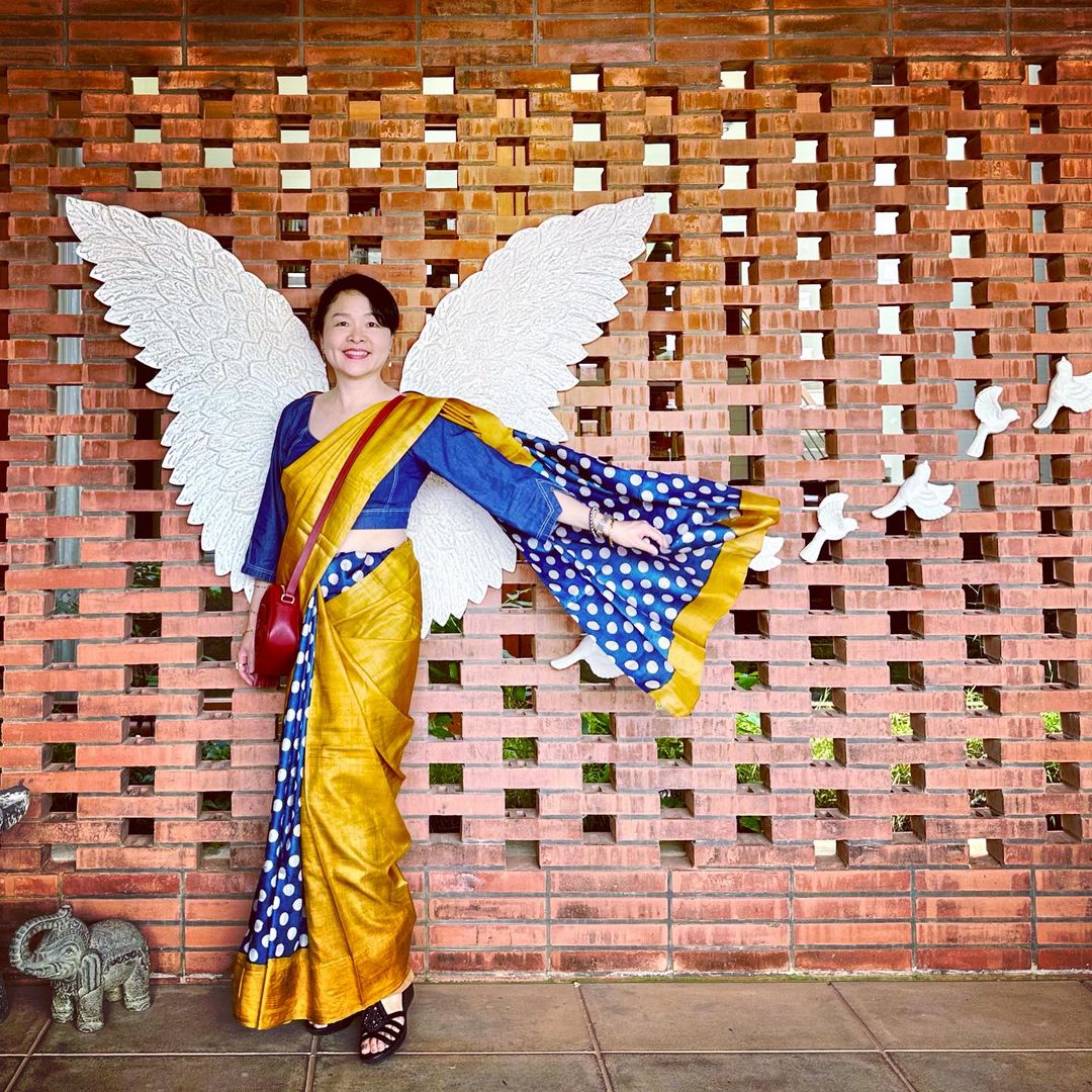 タッサーシルクの軽やかなサリー。ポルカドットが好きなのだ。そして青と黄色の組み合わせがまた、いい。