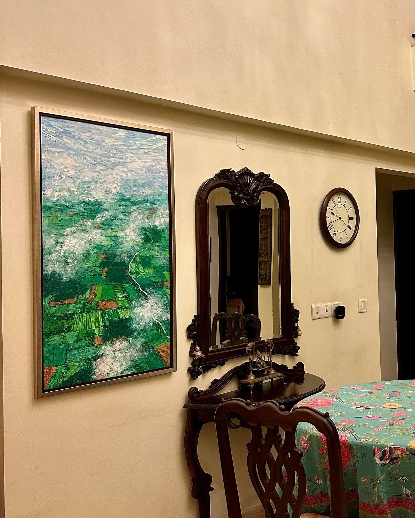 先日、アーティストの友人、JAYAの展示会で購入した絵画のうちの1点。空から大地を見下ろす情景がとても気に入り、新居の自分の書斎に飾るつもりでいた。しかし、先日も記した通り、この先まだ住まう「旧居にも愛を」と感じ、旧居に飾ることにした。